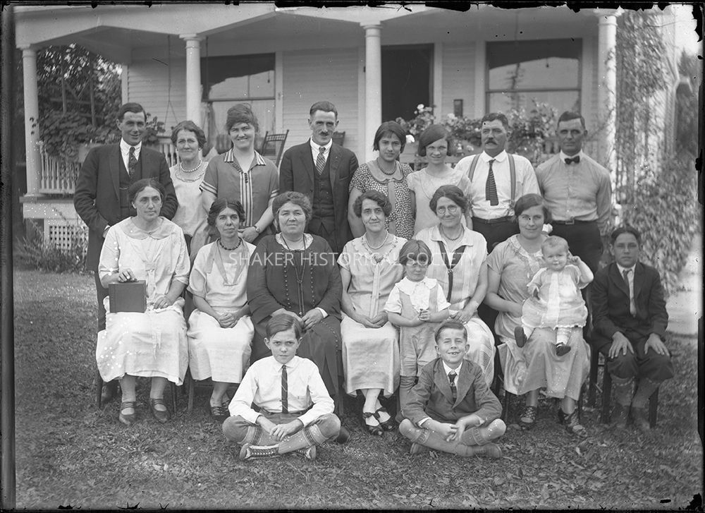 Glass plate negative showing 19 members of the Murfett (and possibly Palmer) family, including 14 adults and five children, posing for a family photograph in front of 18112 Kinsman Road (now Chagrin Boulevard). Photo is extremely similar to 83-3.19.Photograph Details