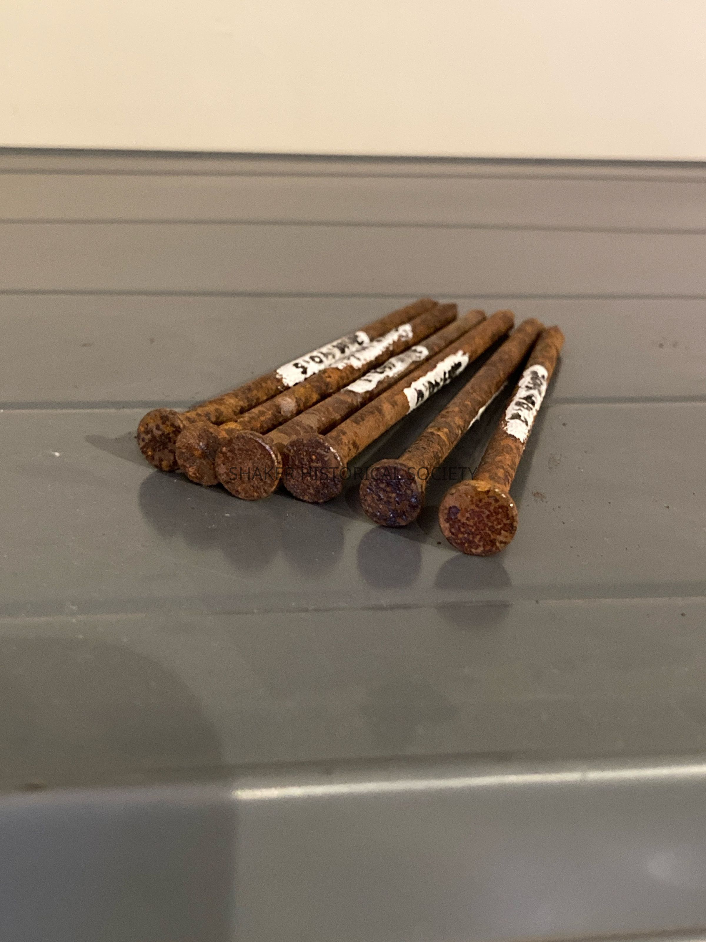 Six rusty nails with round heads, approximately 5 inches long.Acquisition