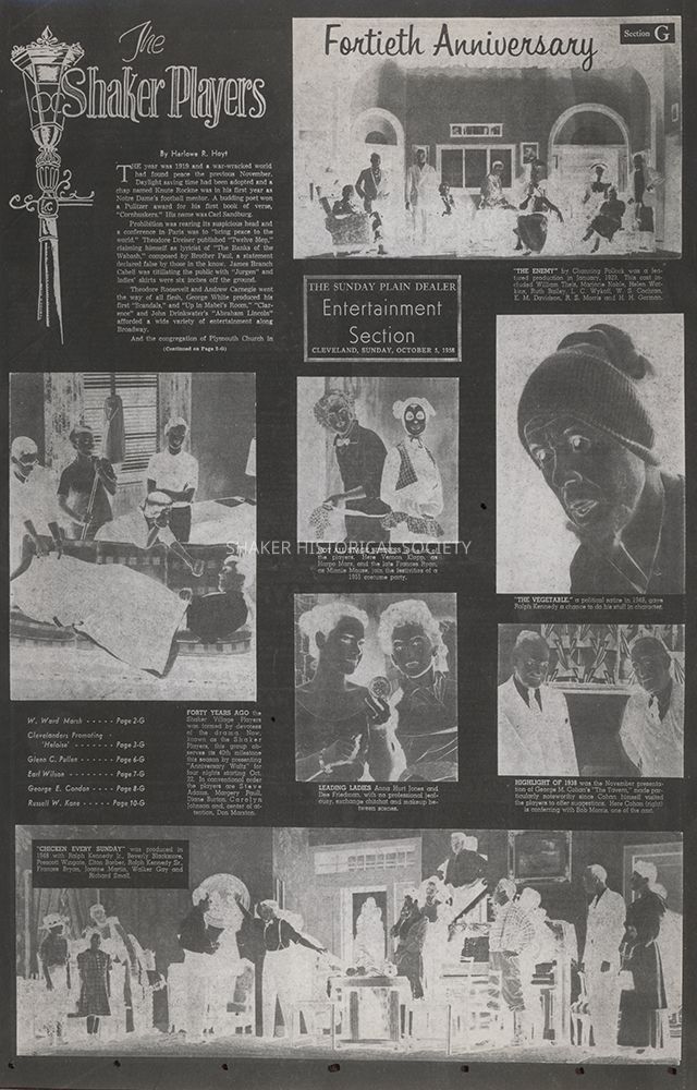 Black-and-white copy photograph of a negative of the front page of the October 5, 1958 Plain Dealer entertainment section celebrating the 40th anniversary of the Shaker Players.Photograph Details
