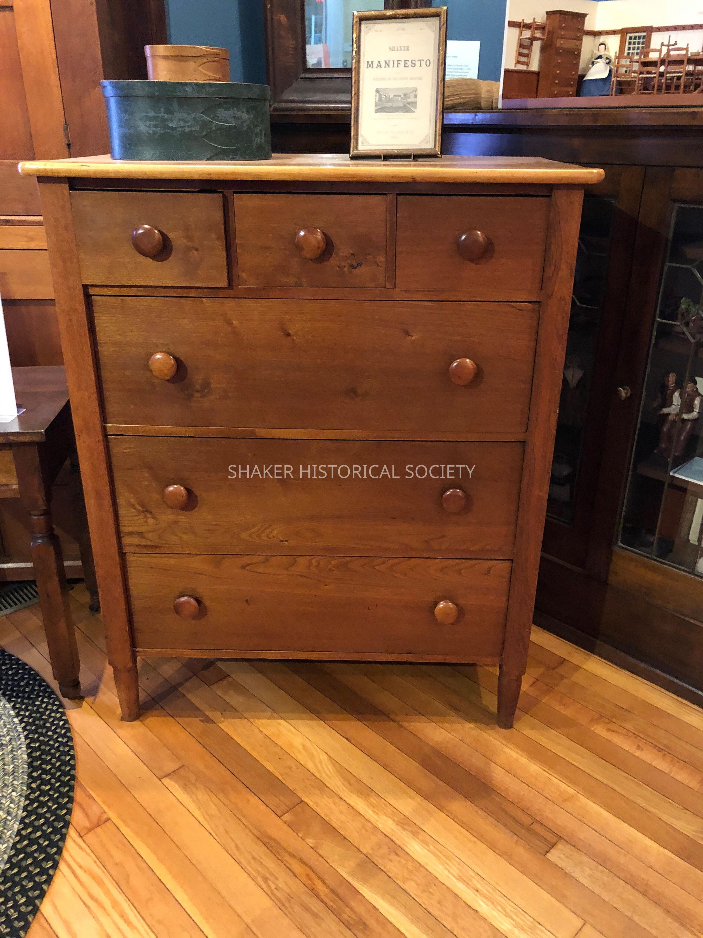Shaker wooden chest/dresser with cherry and curly maple top. Three small drawers over three large drawers, all with turned wooden knobs.Context