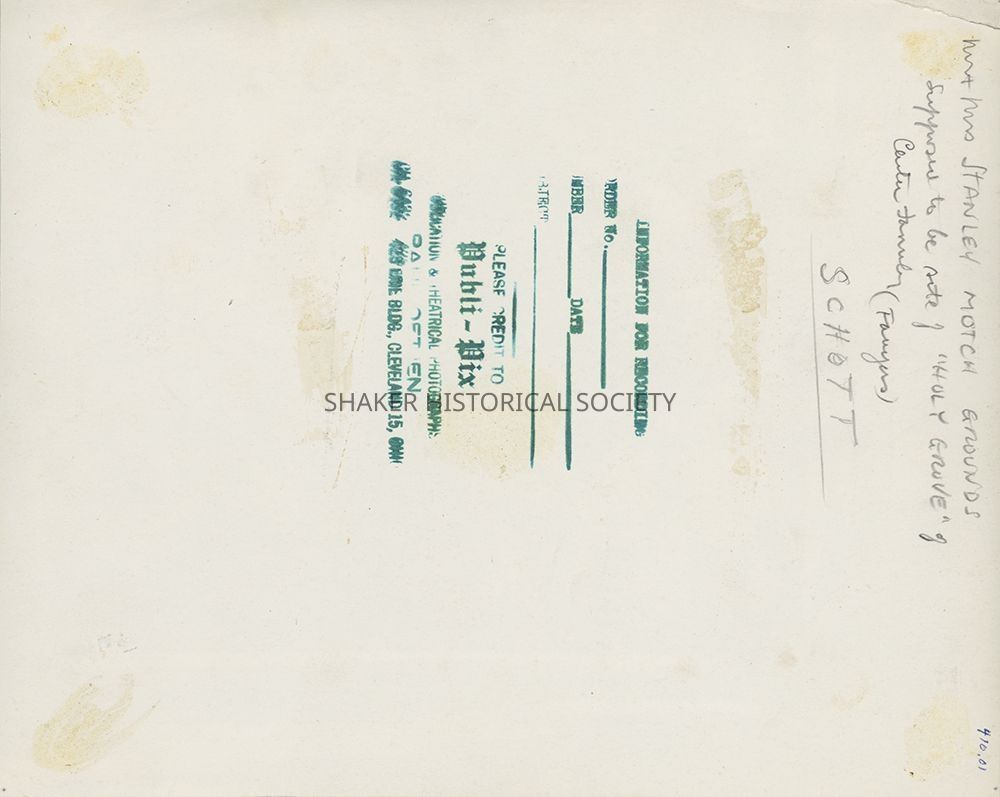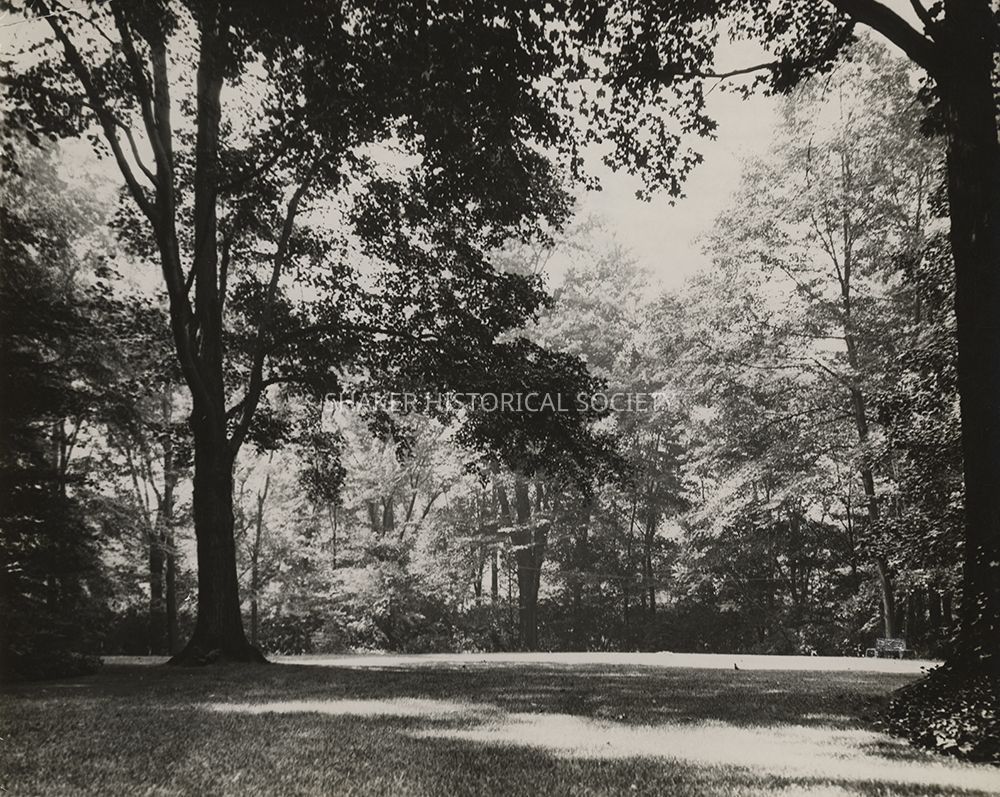 Black-and-white Publi-Pix press photograph of the North Union Shakers' Holy Grove, also known as the Sacred Grove or Jehovah's Beautiful Square. The Holy Grove was a private outdoor worship space established halfway between the North Union Center and East Families during the Era of Manifestations. The remains of the Holy Grove were believed to be on the grounds of the Stanley Motch property, whose house at 17050 South Park was built c.1908. The grove was marked by four locust trees, one in each corner, which may be visible in this photograph.Photograph Details