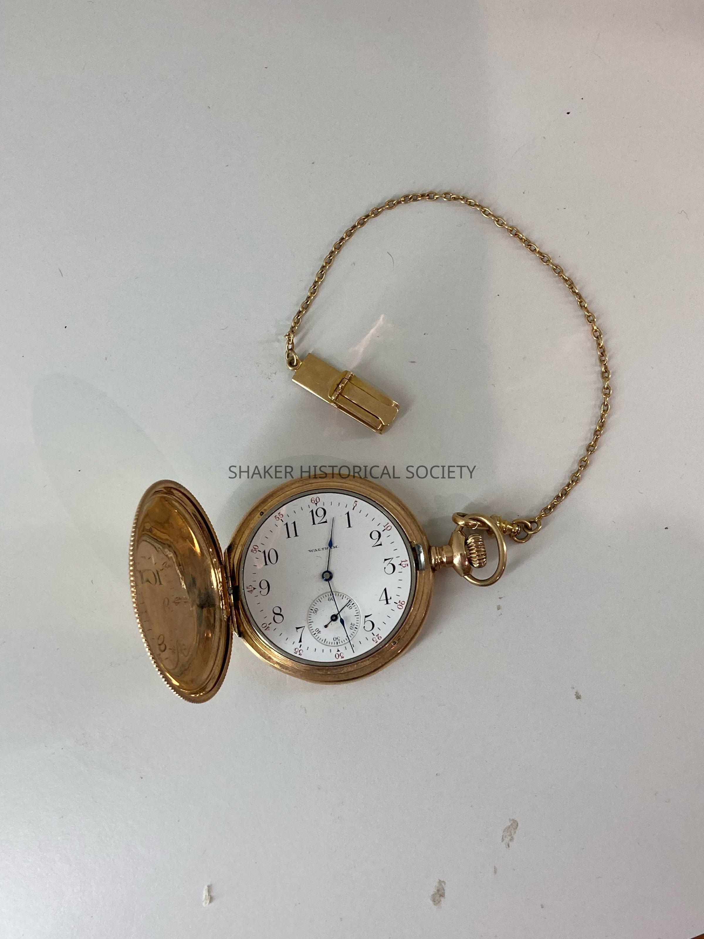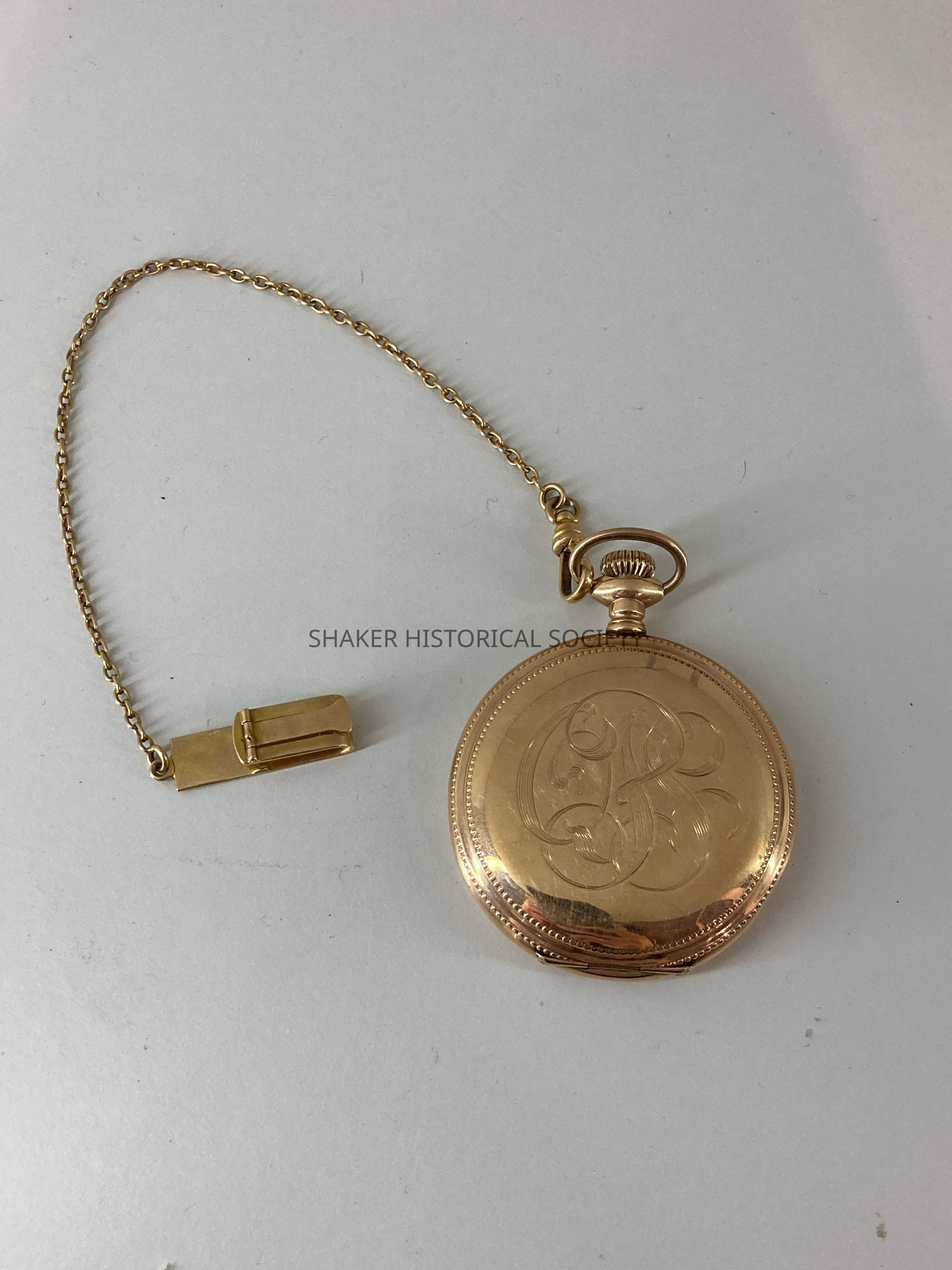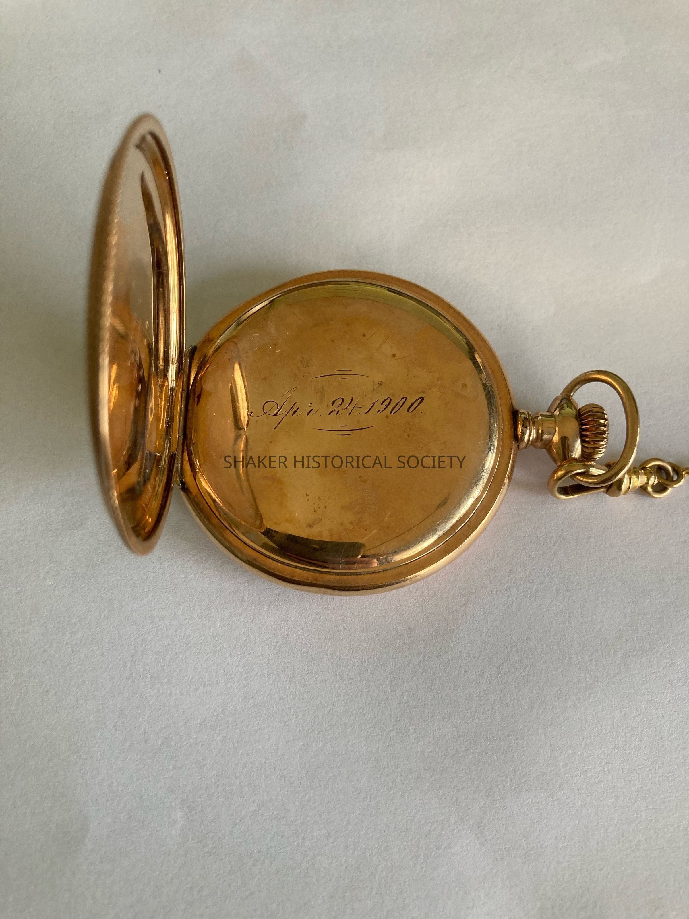 Gold hunter case American Waltham pocket watch monogrammed OPS for O. P. [Van] Sweringen. The "van" in "van Sweringen" was initially dropped by an ancestor to "Americanize" the name, but O.P. and M.J. changed the name back to "Van Sweringen" in the early 1900s. The watch was possibly a birthday gift as the back case opens to reveal an engraved date, April 24, 1900, which was O.P.'s 21st birthday.Acquisition