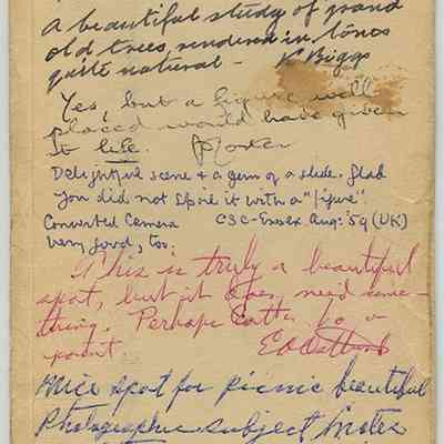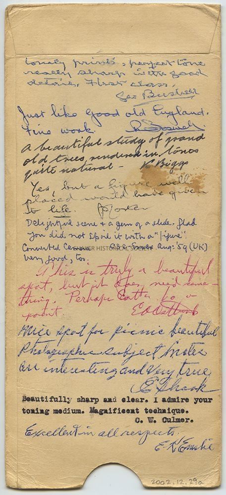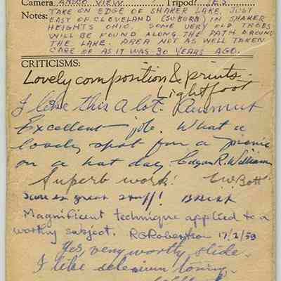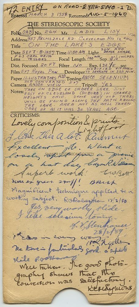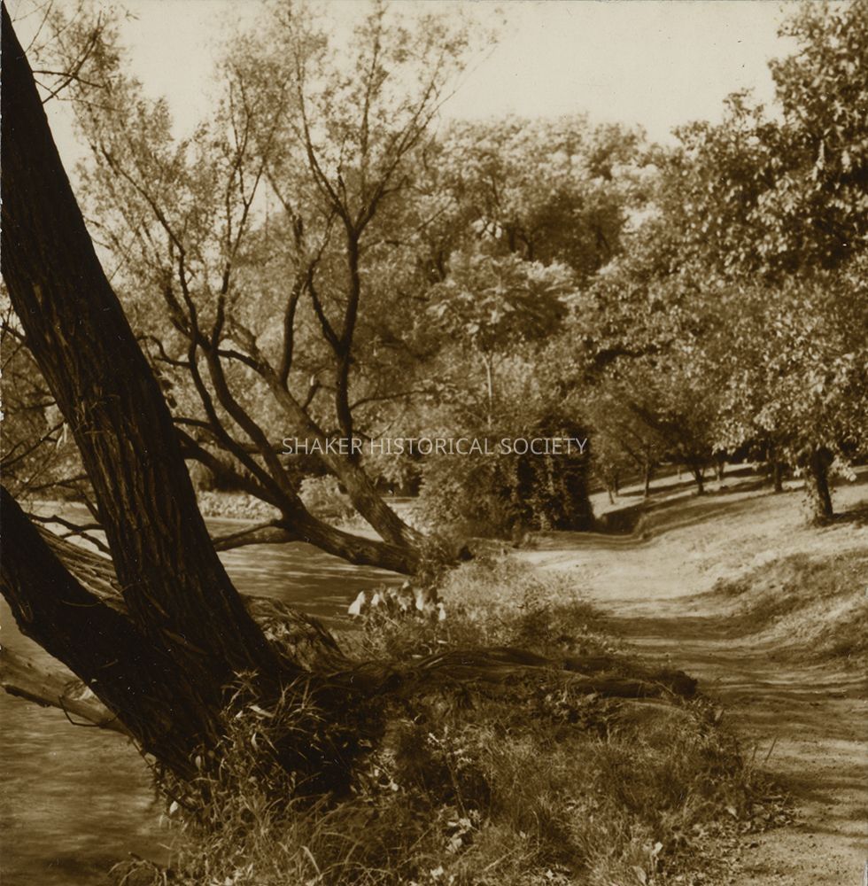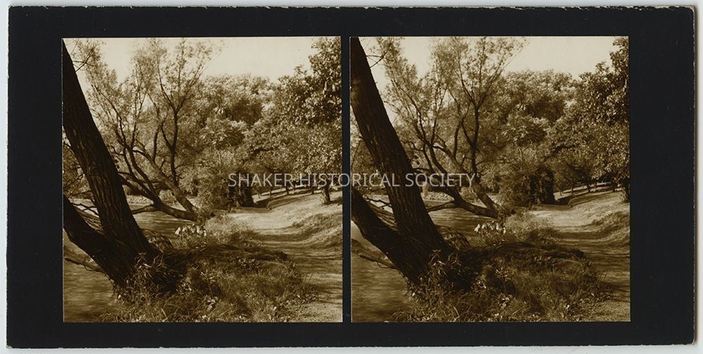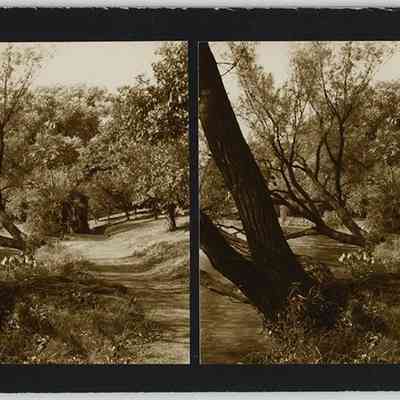 Black-and-white stereograph by Ladis Lisy of a path along the banks of Lower Lake. Photographs are mounted on black board with handwritten notes on verso. Stereoscopic card is housed in a Stereoscopic Society sleeve with information about the photograph and critiques/comments from other members of the Society. Lisy noted on the sleeve that the area was not as well taken care of as it was in the 1920s. Sleeve is dated September 1957, but photographs are dated August 1949 on verso.Photograph Details