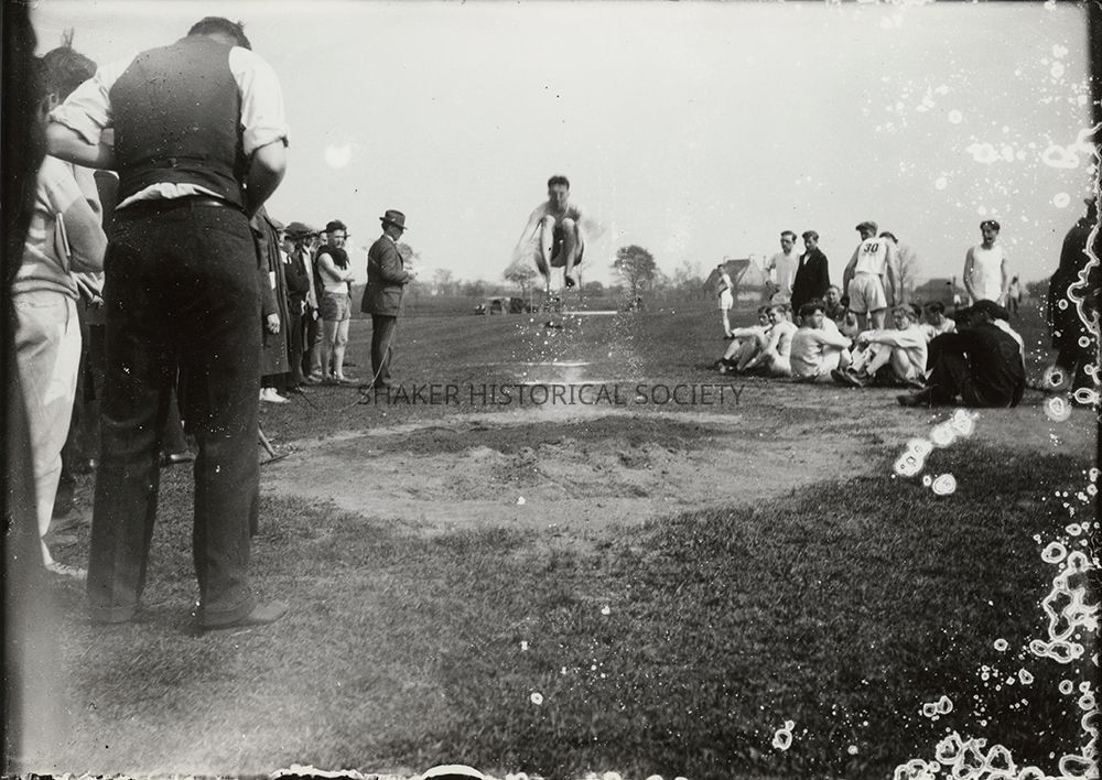 Black-and-white photograph printed from glass plate negative 2024.3.13 of an unidentified athlete long jumping into a sand pit. Two men in suits stand to the side with a measuring tape while other athletes watch on the sidelines. Title taken from note accompanying photograph.Photograph Details