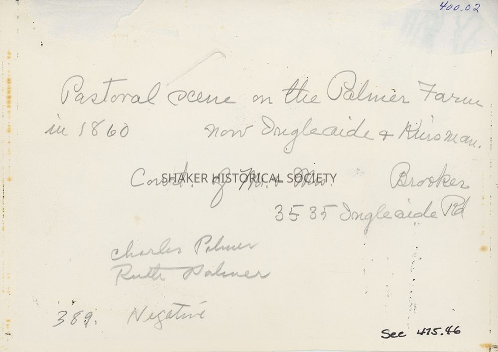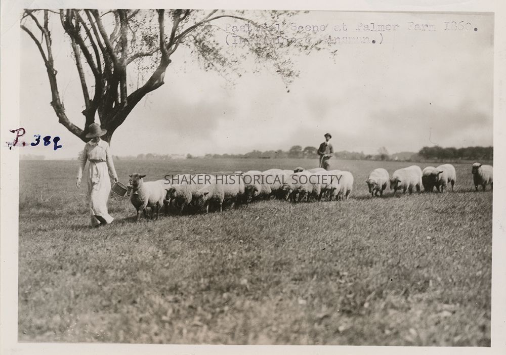 Black-and-white photograph of a pastoral scene of Charles Palmer and his daughter Ruth Palmer with sheep on the Palmer Farm at Ingleside and Kinsman (now Chagrin). Photo is incorrectly dated to 1860; the Palmers did not own the land until 1865, and Ruth Palmer was born in 1898. Photo was likely taken around 1912 when other photographs of the Palmer daughters on the farm were taken by Louis Baus.Photograph Details