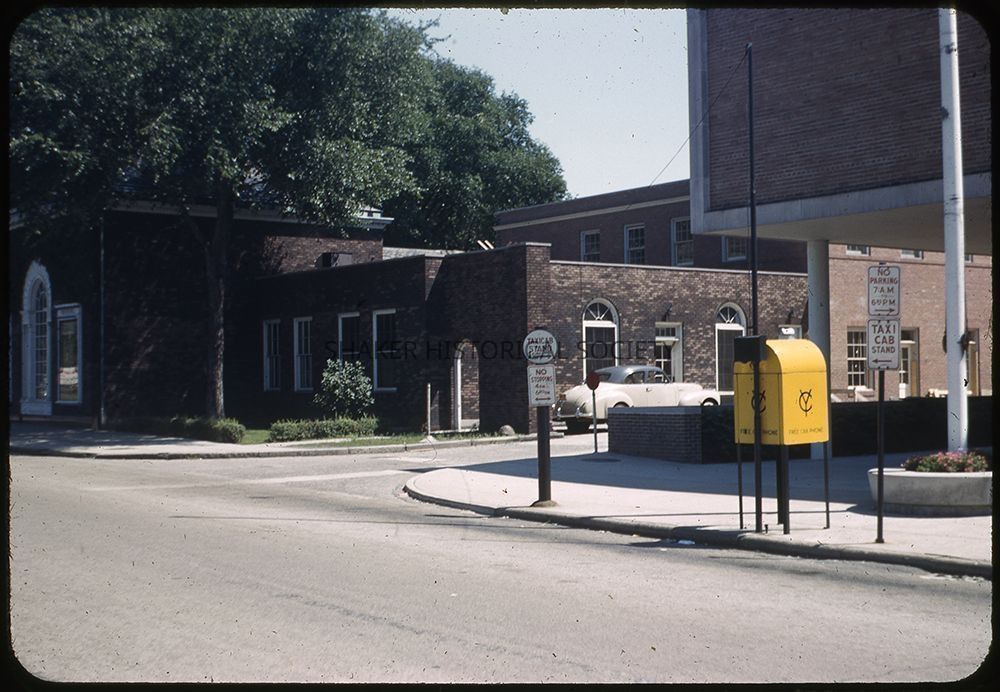 Color slide (Kodachrome) of a yellow phone booth at Halle Bros. on Shaker Boulevard, near the southwest quadrant of Shaker Square.Photograph Details