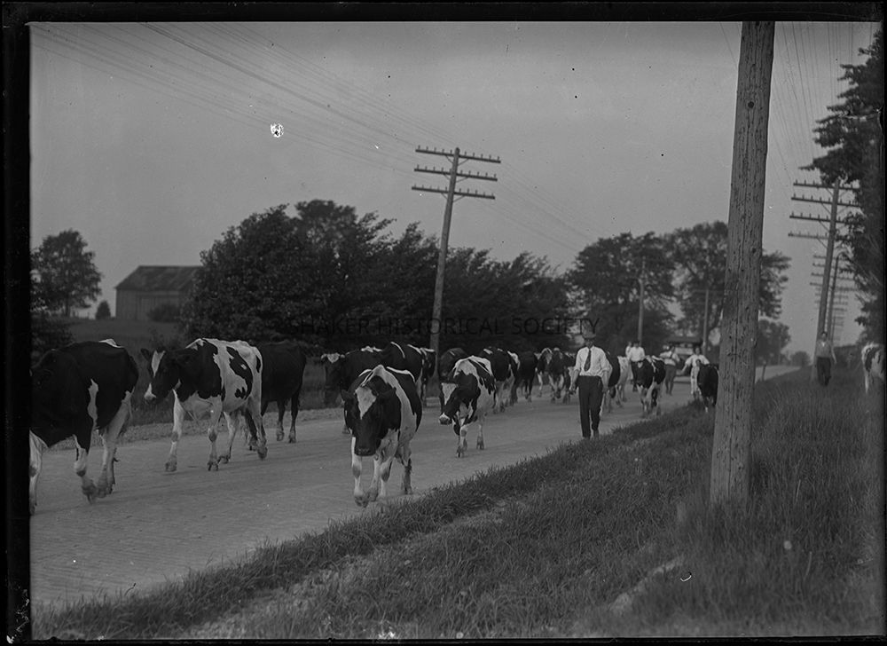 Glass plate negative showing several people, presumably members of the Murfett and/or Palmer family, herding a group of cows down an unidentified road. Likely connected to scene pictured in 83-3.10.Photograph Details