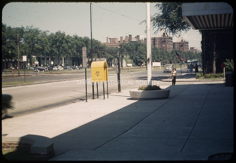 Color slide (Kodachrome) of a yellow phone booth at Halle Bros. on Shaker Boulevard, near the southwest quadrant of Shaker Square. Moreland Courts is visible in the background.Photograph Details