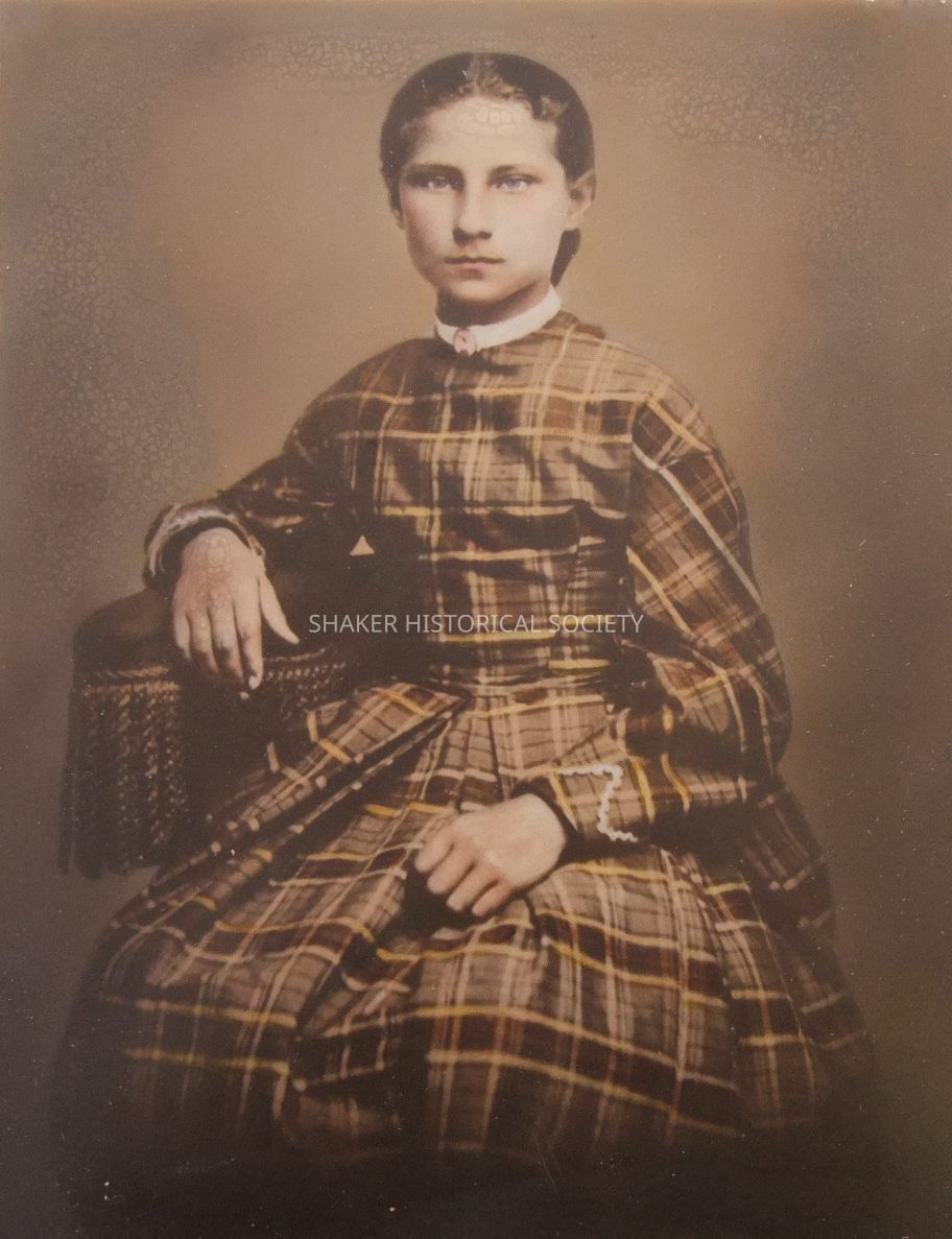 Framed photograph of Phoebe Litzel in a plaid dress taken before she entered the North Union Shaker Community.Photograph Details