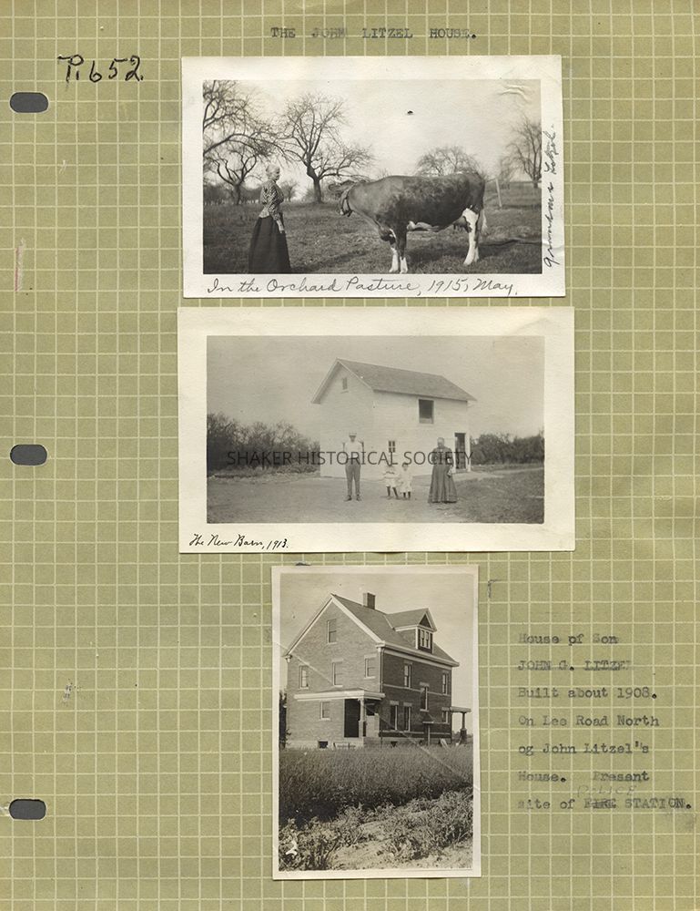 Page from a Warrensville Township scrapbook (SCR WAR 5) with three photographs of the John Litzel property along Lee Road, including an orchard, a new barn, and the John G. Litzel House, built c. 1908. John G. Litzel was the son of John and Louisa Litzel.Photograph Details