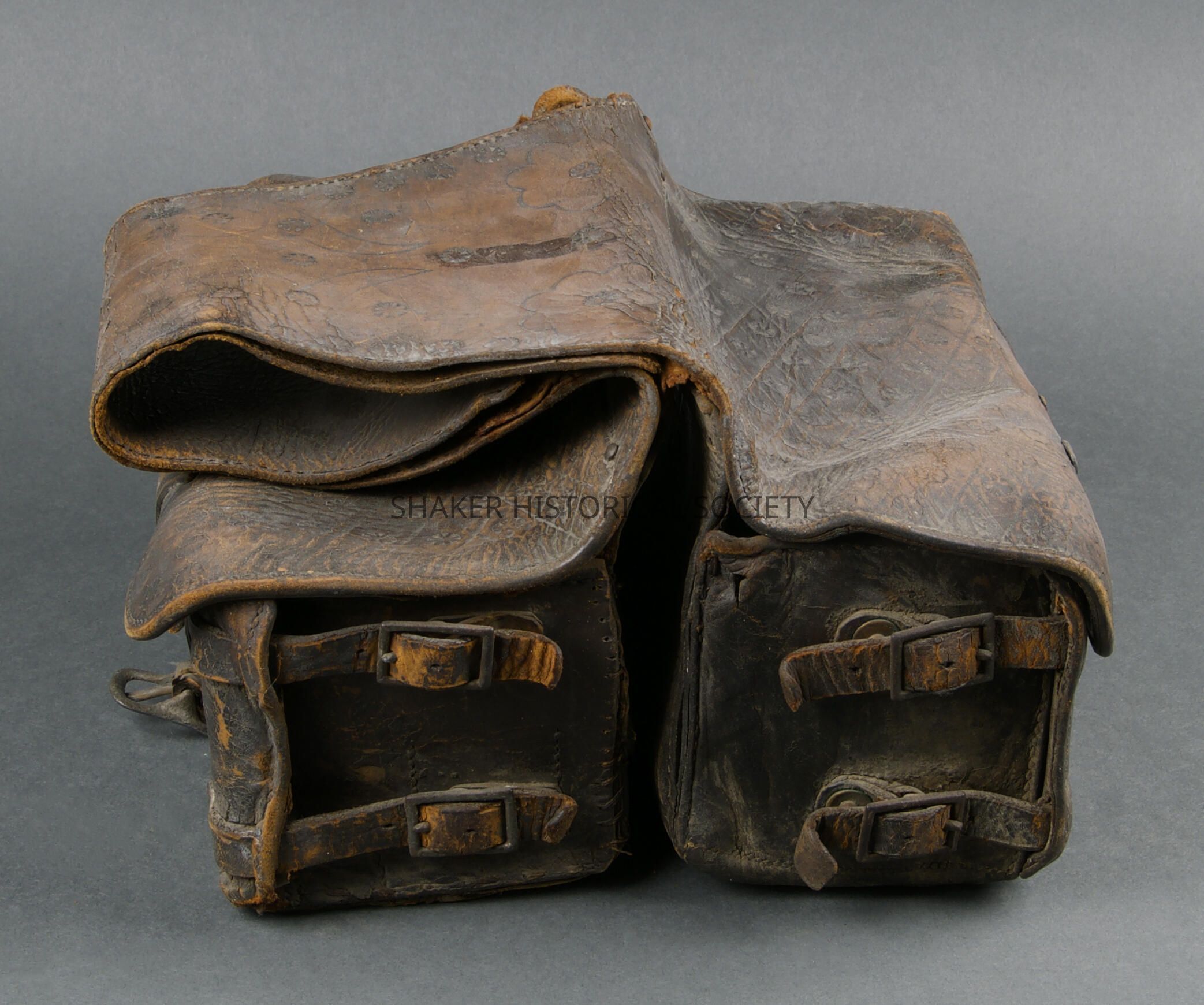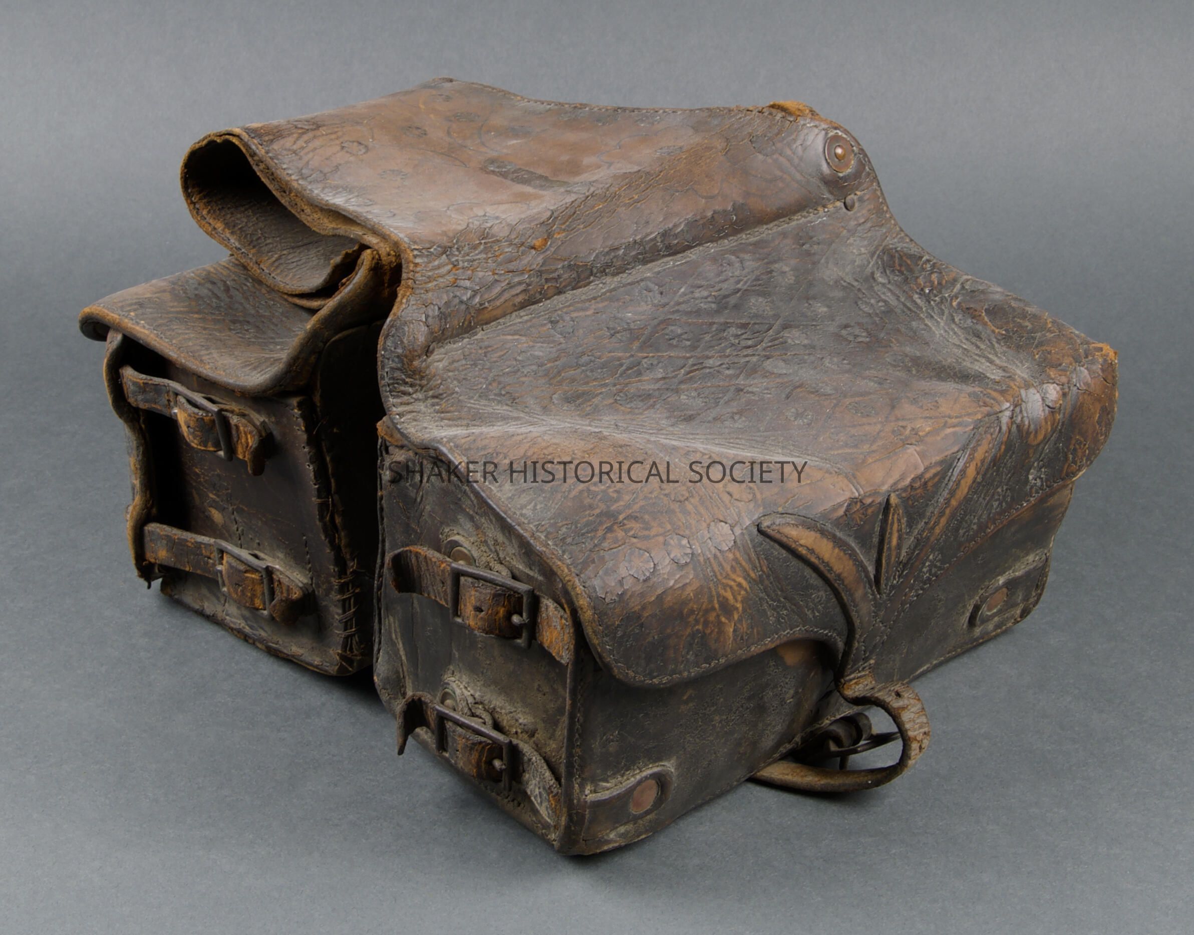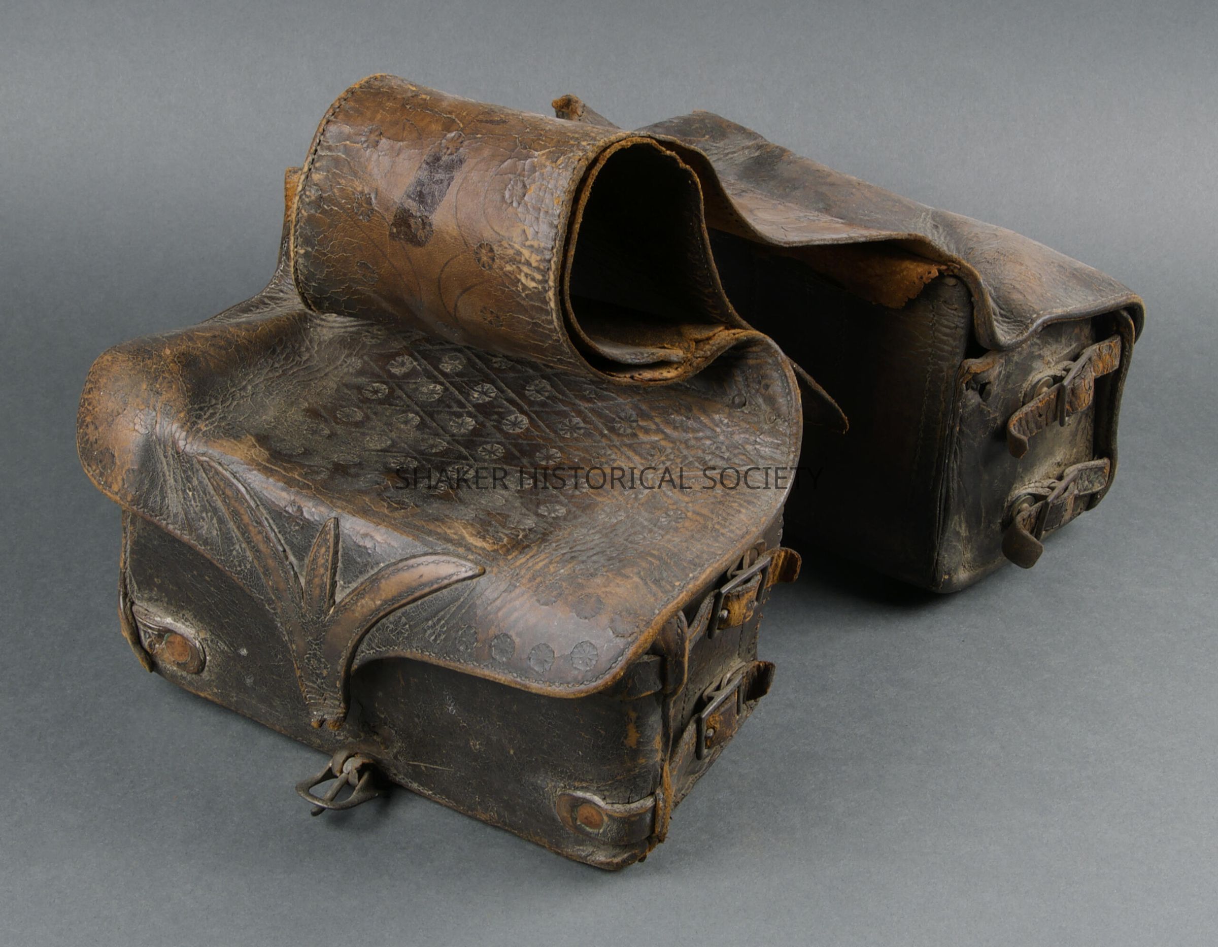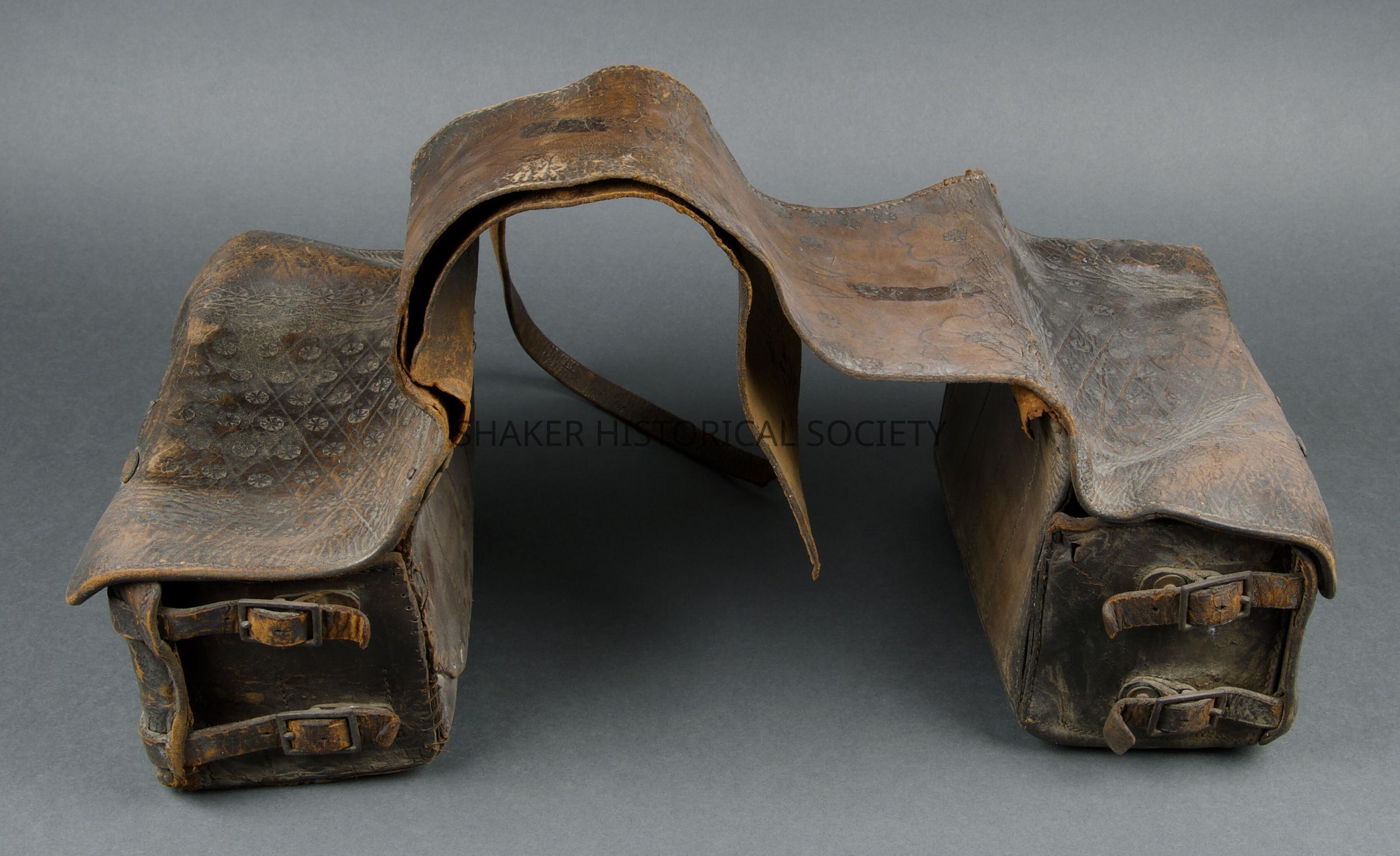 Leather saddle bags used by a physician for house calls. Decorative elements and embossing. Red rot around buckles and areas of stress. Strap broken on one side.Collection
