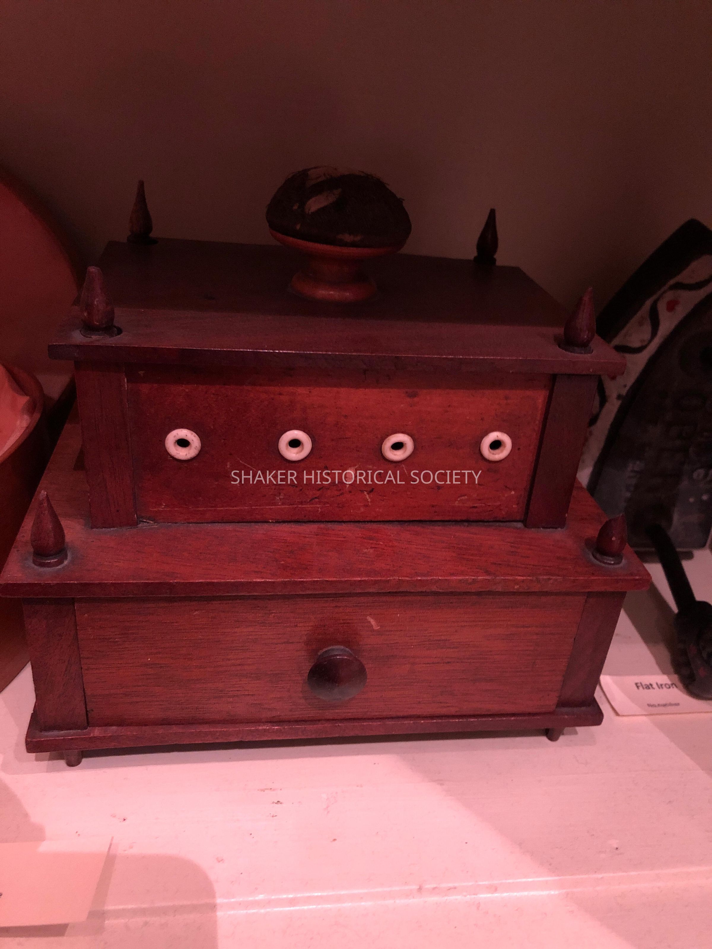 Victorian-style pin cushion and spool holder. Wood. Includes small drawer.Collection