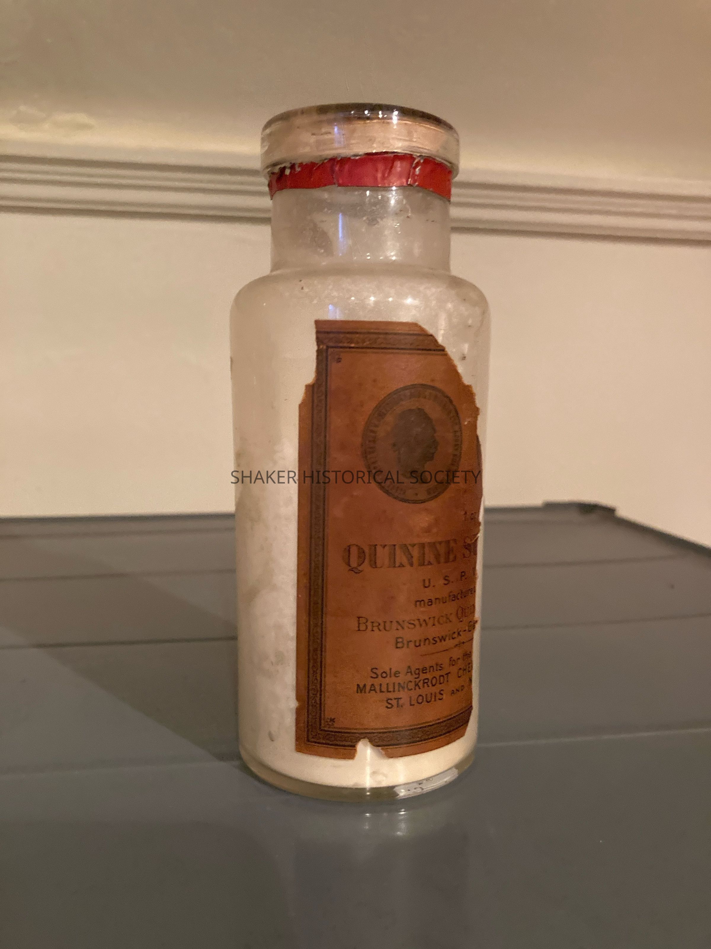 Glass bottle containing quinine sulphate powder manufactured by Brunswick Quinine Works in Brunswick, Germany and sold by Mallinckrodt Chemical Works in the United States.Collection