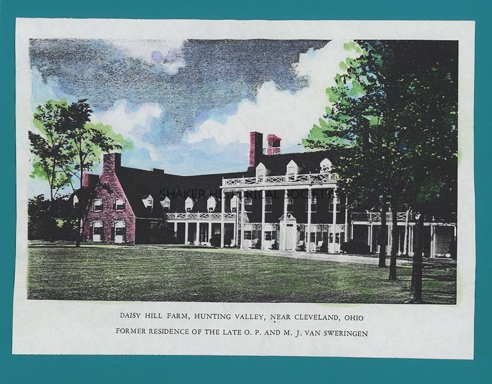 Hand-colored black-and-white reproduction photograph, likely from a book or magazine, of Roundwood Manor at Daisy Hill, the Van Sweringen's country estate in Hunting Valley. The photograph is pasted to teal cardstock.Photograph Details