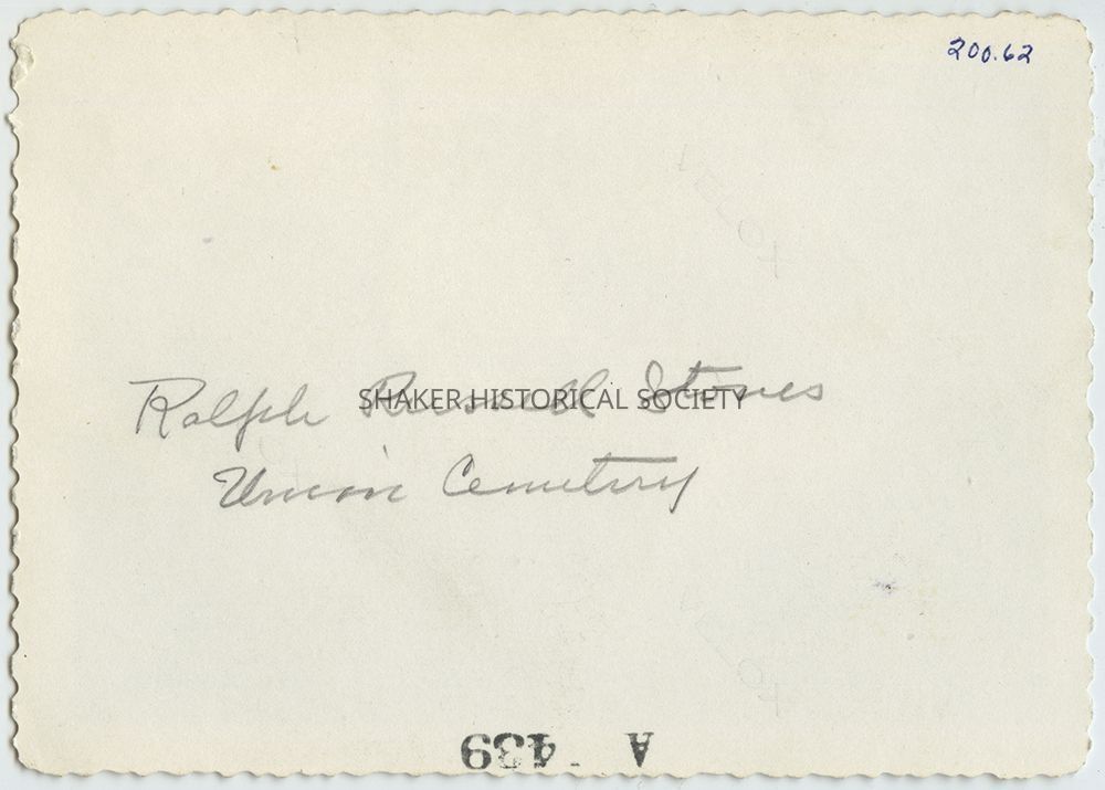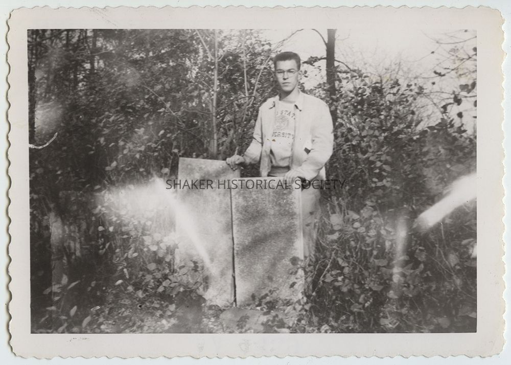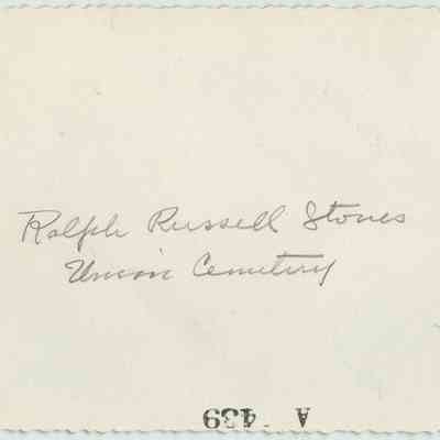 Black-and-white photograph with deckled edges of an unidentified young man in glasses standing with two Russell Family headstones at Union Cemetery. "Ralph Russell Stones, Union Cemetery" written on verso.Photograph Details