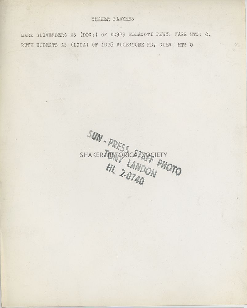 Black-and-white theatrical publicity photograph by Tony Landon of the Sun Press showing Shaker Players cast members Ruth Roberts and Mark Silverberg in "Come Back, Little Sheba." Identifying information on verso.Photograph Details