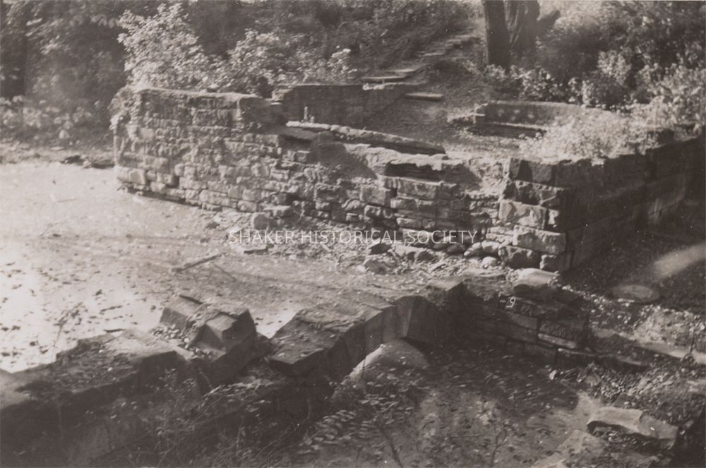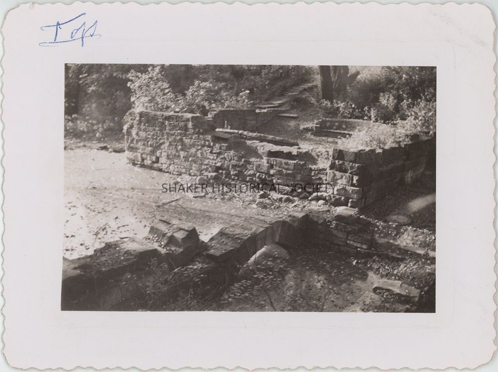 Undated black-and-white photograph with deckled edges of the North Union Shaker sawmill ruins near Lower Lake, looking west toward Coventry Road. The stone benches added by the Shaker Lakes Garden Club are visible within the foundation, dating the photo to the post-1927.Photograph Details