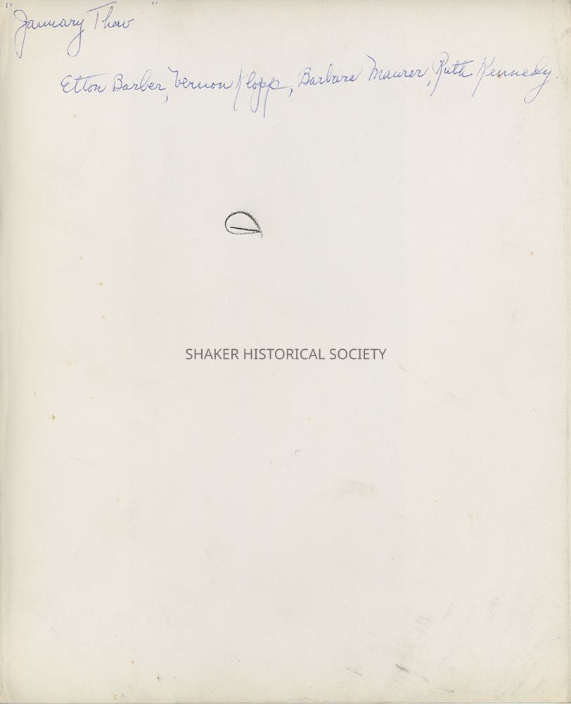 Black-and-white theatrical publicity photograph showing five Shaker Players cast members in "January Thaw": Elton Barber, an unidentified woman, Vernon Klopp, Barbara Maurer, and Ruth Kennedy. Identifying information written on verso.Photograph Details