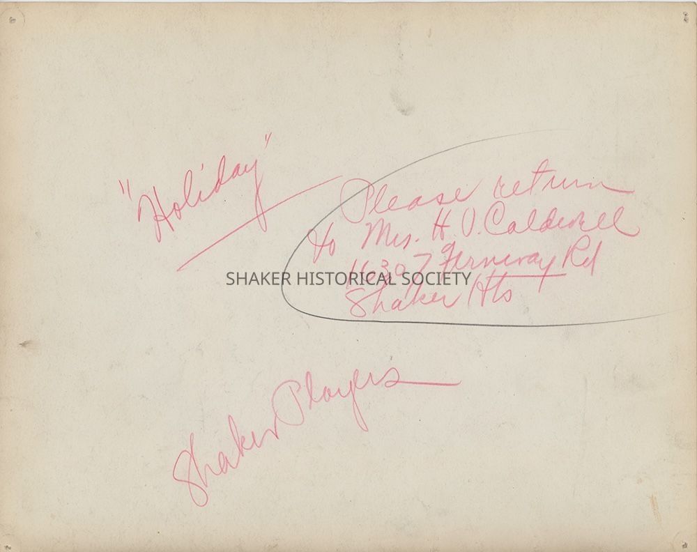 Black-and-white theatrical publicity photograph showing Shaker Players set of "Holiday." Identifying information written on verso.Photograph Details