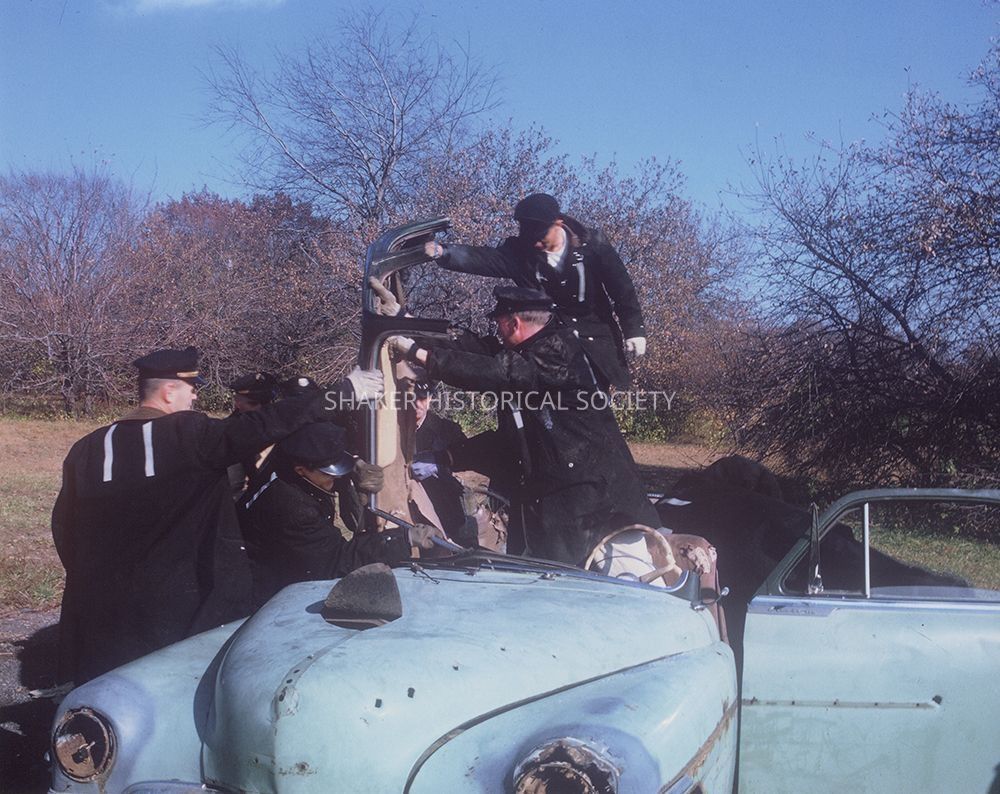 Color inkjet print of an undated photograph depicting at least seven fire fighters removing the roof of a blue car, possibly a 1950s Chevrolet.Photograph Details