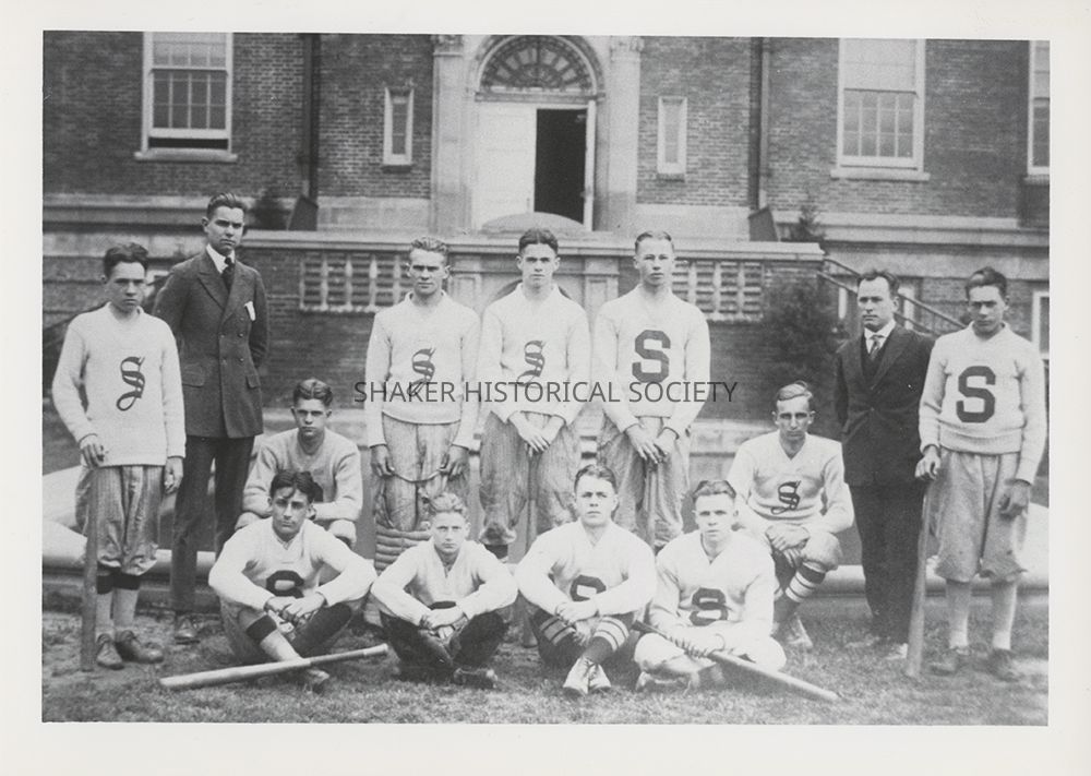 Reproduction black-and-white photograph of the Shaker Heights High School (now Woodbury) baseball team. Last names are identified on 420.37. First row, left to right: Brown, Corlett, Weed, Suloff. Second row, left to right: Shaw, Pratt (Manager), Davis, Sayle, Rudolph, Kinsy, Dempcy, Burnham (Coach), Douda.Photograph Details