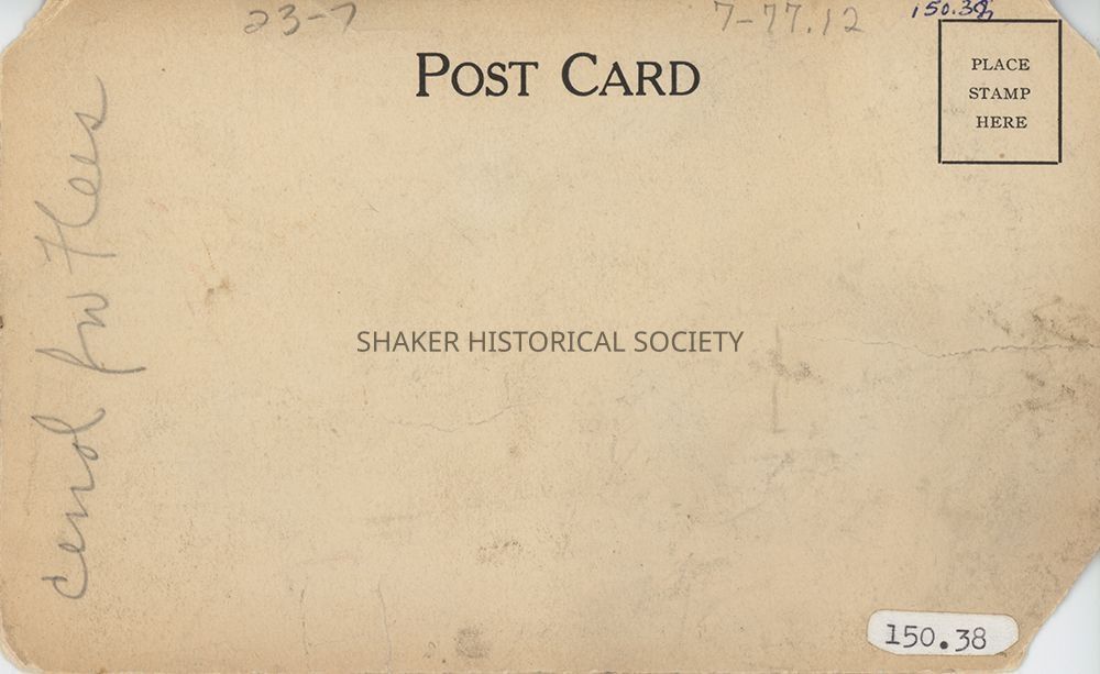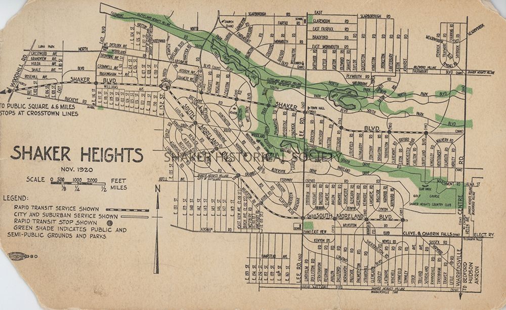 Postcard from an unidentified publisher featuring a November 1920 map of Shaker Heights. The legend identifies rapid transit lines, city and suburban lines, and rapid transit stops. Green shade indicated public and semi-public grounds and parks. The top left and bottom left corners are missing. A Cleveland Union Label is visible near the bottom left corner. An illegible note is written in pencil on verso.Subject Place