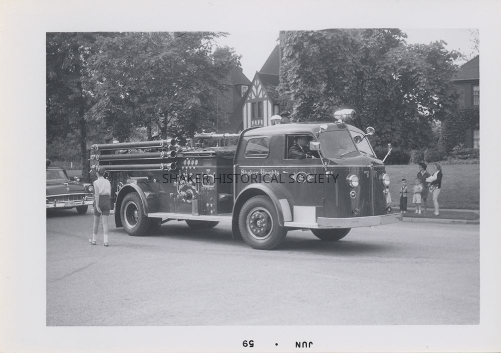 Black-and-white photograph dated June 1959 of Shaker Heights Fire Department Fire Engine No. 2 in the Shaker Heights Memorial Day Parade. The photograph was taken from the corner of Daleford and Elsmere Roads, and the Tudor house visible in the background is 3380 Daleford.Photograph Details