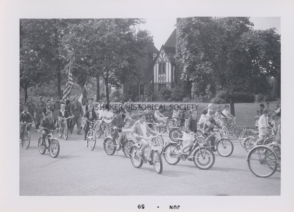 Black-and-white photograph dated June 1959 of a group of children on bikes in the Shaker Heights Memorial Day Parade. The photograph was taken from the corner of Daleford and Elsmere Roads, and the Tudor house visible in the background is 3380 Daleford.Photograph Details
