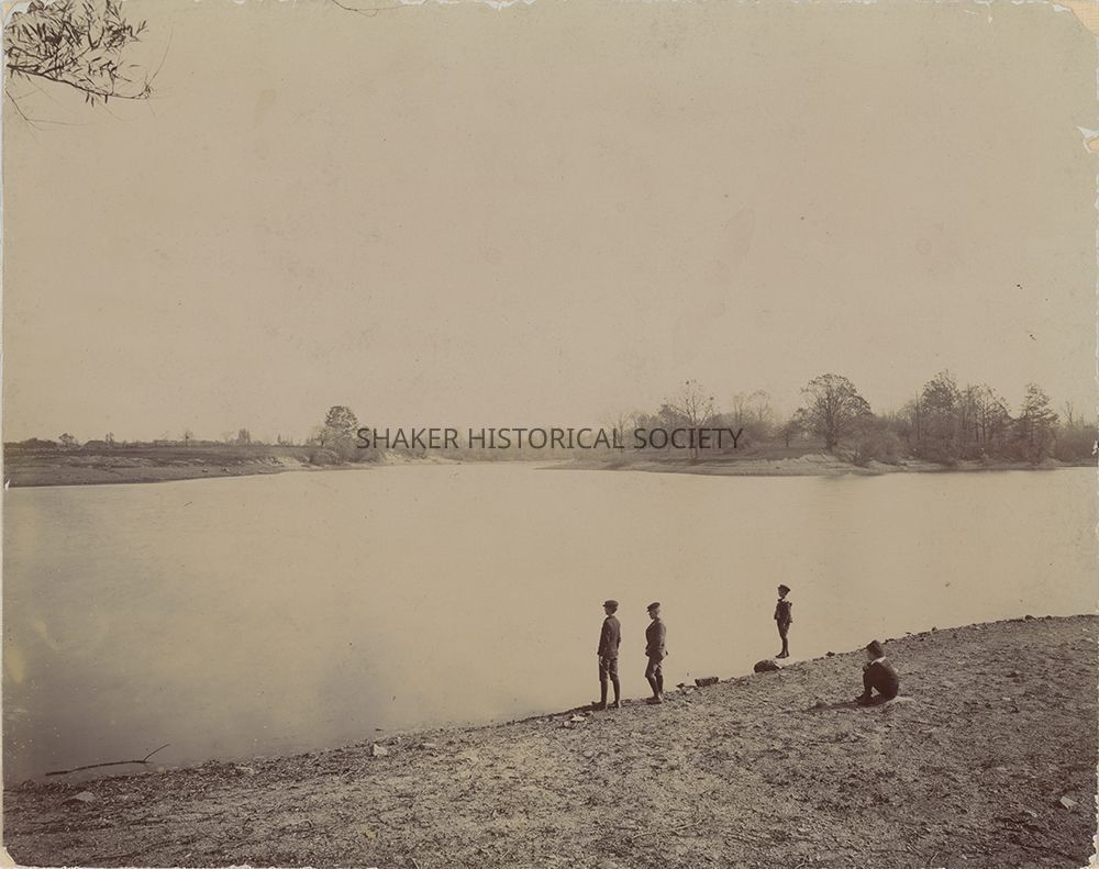 Black-and-white photograph from 1894 of four children along the banks of Upper Lake (Horseshoe Lake) at Shaker Heights Park. The photograph is a northeast view of the lake. Title taken from caption on verso.Photograph Details