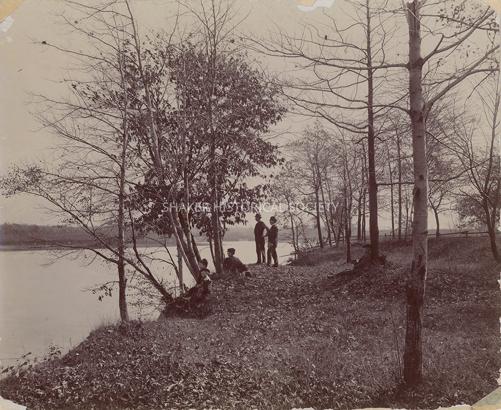 Black-and-white photograph of five people along the banks of Shaker Heights Park, 1894. Title taken from caption on verso.Photograph Details