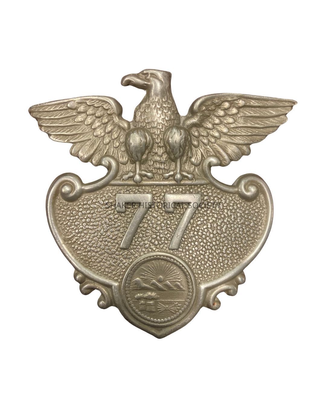 #77 Shaker Heights Police Department badge worn by worn by Ernest Alvadore Rumbold, most likely in the 1950s or 1960s. The badge features an eagle with open wings at the top and the Great Seal of the State of Ohio at the bottom.Acquisition