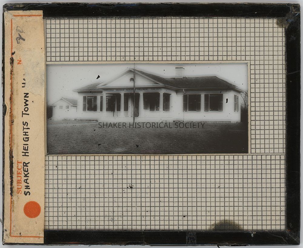 Undated glass lantern slide featuring a black-and-white photograph of the Shaker Village Town Hall, which also housed the fire department, at the Lee-Shaker intersection. Label taped along left side reads "Shaker Heights Town H[all]." Black tape around edges is flaking.Photograph Details