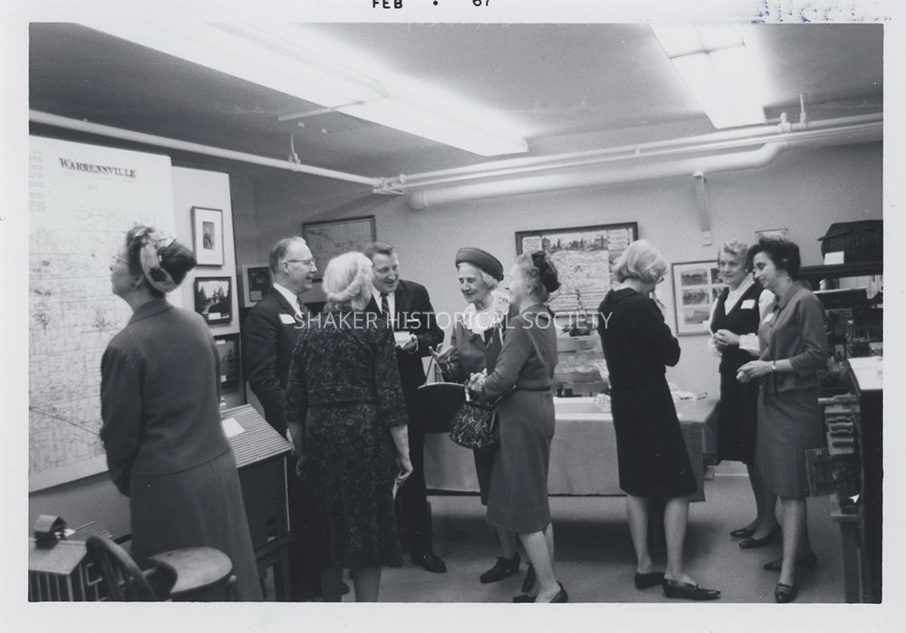 Black-and-white photograph dated February 1967 of a group of adults gathered for an event at the Shaker Historical Society, then located in the basement at Boulevard School.Photograph Details
