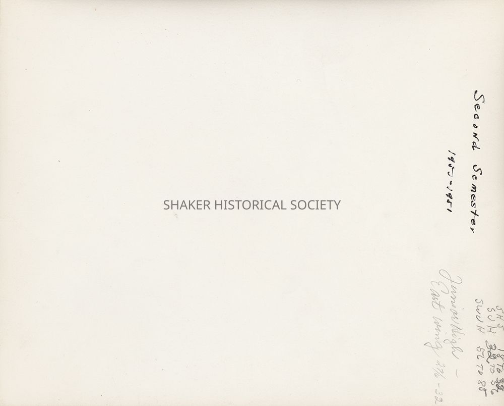 Black-and-white photo of Shaker Junior High School (now Woodbury) students and staff during the second semester of the 1950-1951 school year. Writing on verso notes the location as the east wing of the school.Photograph Details