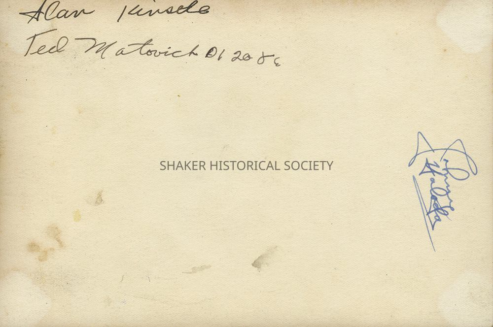 Black-and-white photograph of male students and teacher in an unidentified 1946 Shaker Junior High School class. Autographs on verso.Photograph Details