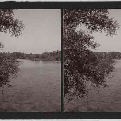 Toned black-and-white stereograph photographs by Ladis Lisy of Lower Lake. The Brook Road bridge and spillway are visible in the background. Photographs are mounted on black board with handwritten notes on verso.Photograph Details