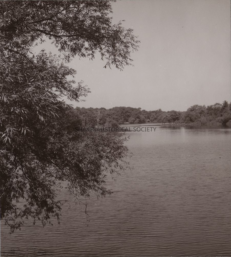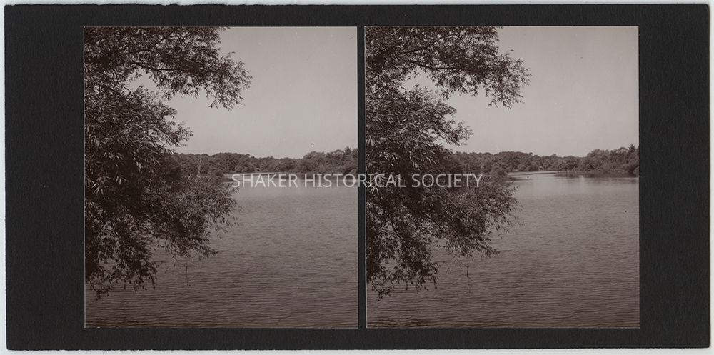 Toned black-and-white stereograph by Ladis Lisy of Lower Lake. The Brook Road bridge and spillway are visible in the background. Photographs are mounted on black board with handwritten notes on verso.Photograph Details