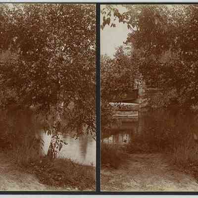 Sepia-toned black-and-white stereograph photographs by Ladis Lisy of the Brook Road bridge and dam spillway at Lower Lake. Photographs are mounted on black board with handwritten notes about the date, location, exposure, and developer on verso.Photograph Details
