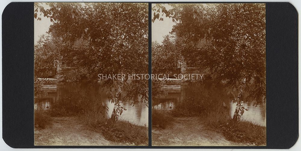 Sepia-toned black-and-white stereograph by Ladis Lisy of the Brook Road bridge and dam spillway at Lower Lake. Photographs are mounted on black board with handwritten notes about the date, location, exposure, and developer on verso.Photograph Details