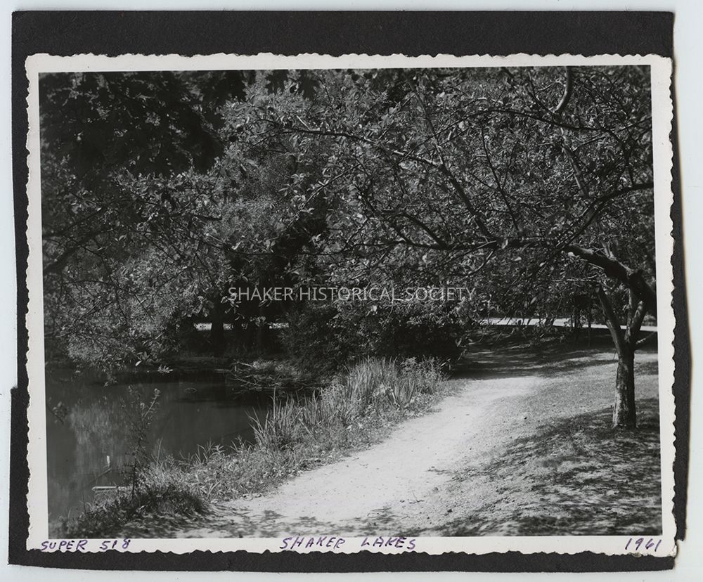 Black-and-white photograph with deckled edges by Ladis Lisy of trees and a path along the bank of Lower Lake. "Super 518 / Shaker Lakes / 1961" is handwritten in the bottom margin. The photograph is adhered to a piece of black paper.Photograph Details