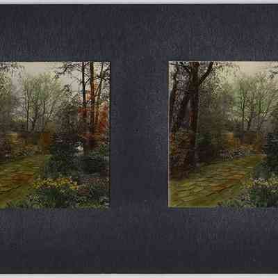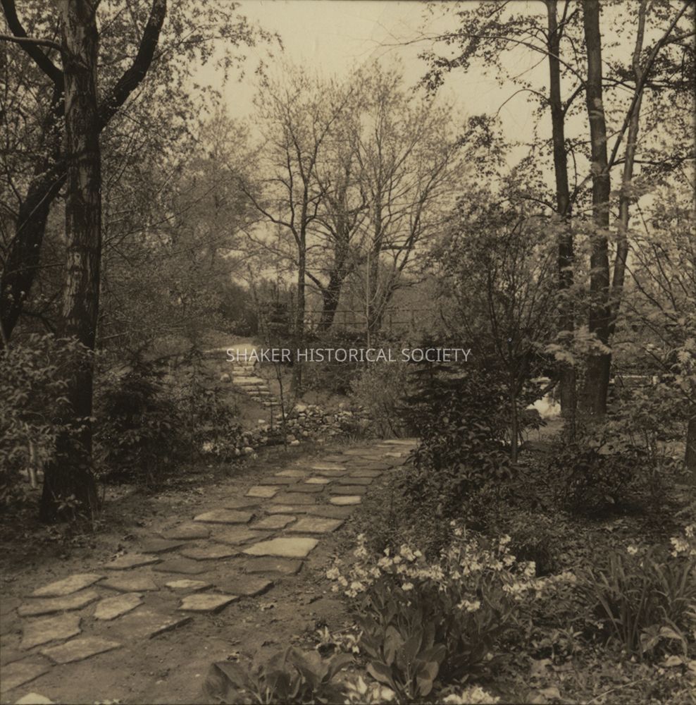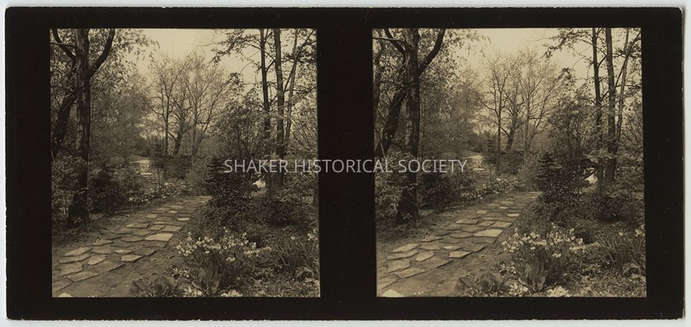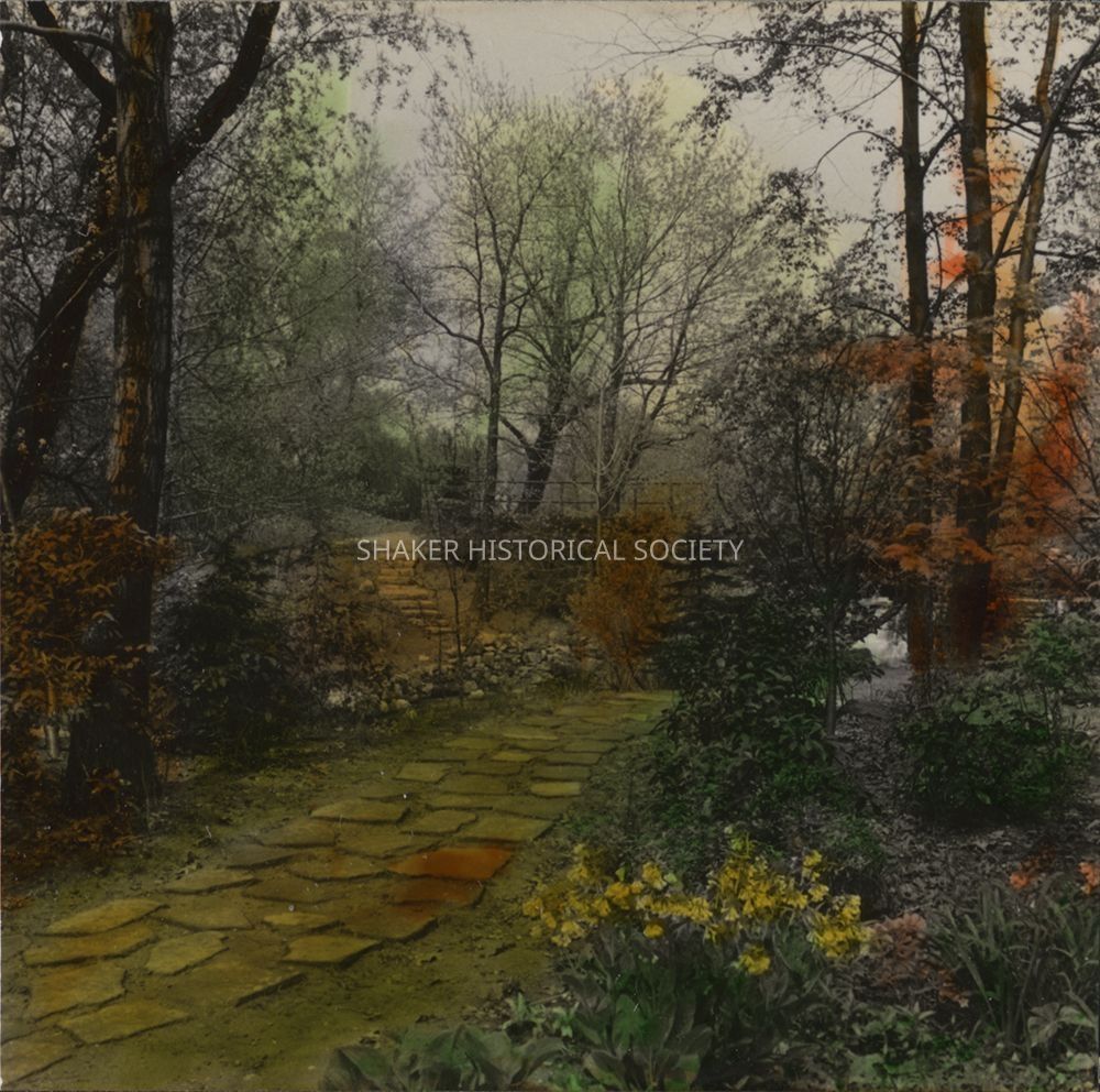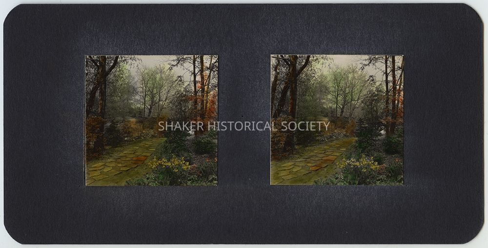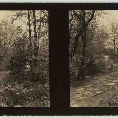 Handcolored black-and-white stereograph by Ladis Lisy of the bird sanctuary and wildflower preserve at Lower Lake. Photographs are mounted on black board with handwritten notes about the date, location, exposure, and developer on verso. Photograph depicts a flagstone path surrounded by trees and flowers. A bridge, mostly likely Coventry Road, and stone staircase are visible in the background.