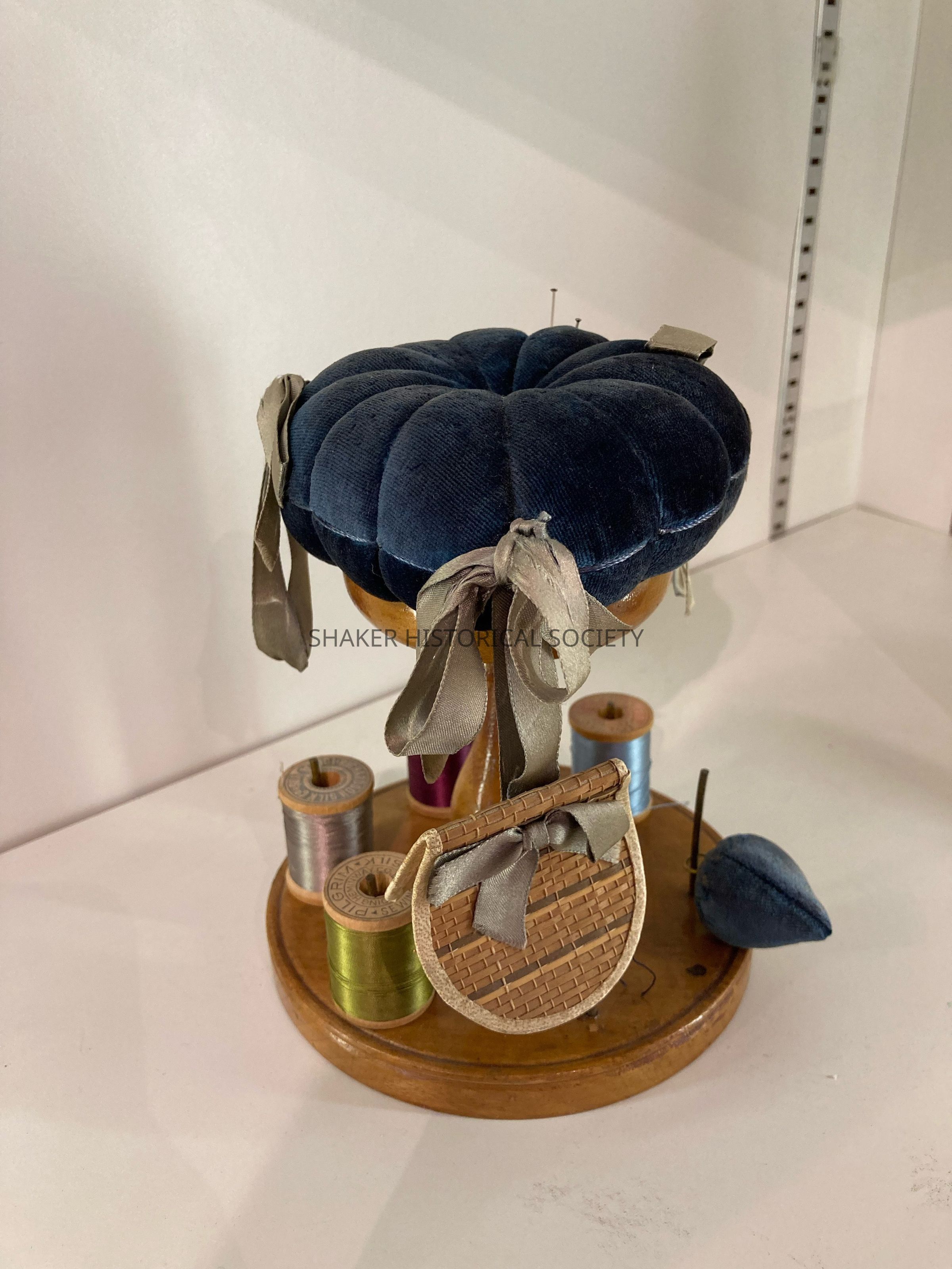 Pincushion and spool holder. Pin cushion is blue velvet. Total height 6.5" Base 5" diam. Wood frame to hold pin cushion with emery ball of blue velvet and needle holder. Pins for six spools of thread.Acquisition