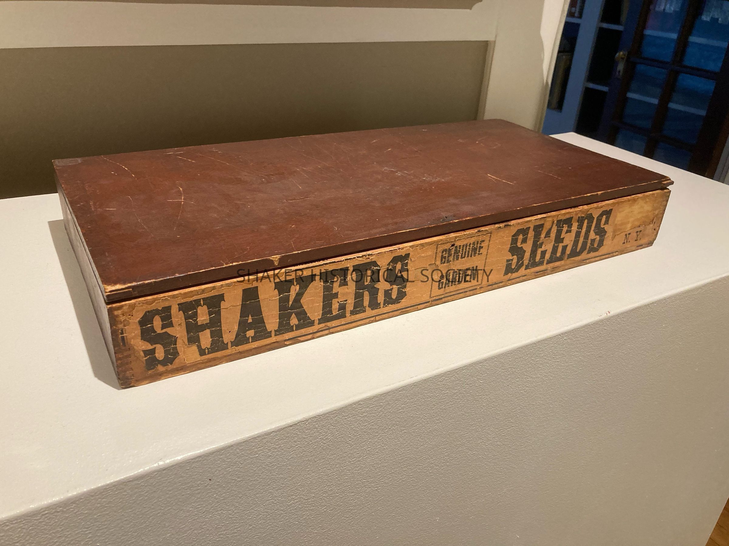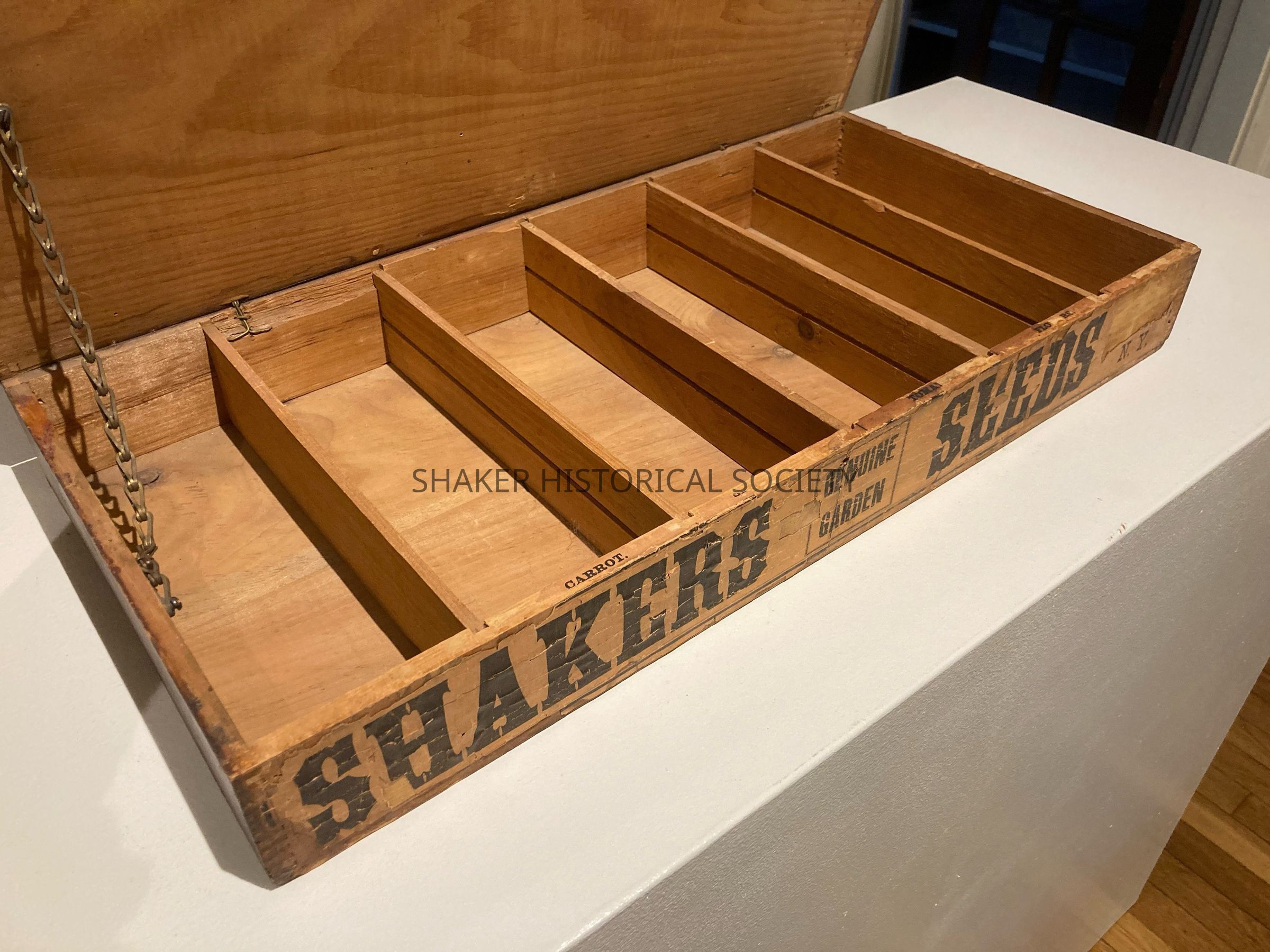 Wooden Shaker seed box, painted and labeled “Shaker Seeds; Genuine Garden”. Partitioned in six spaces across.Context