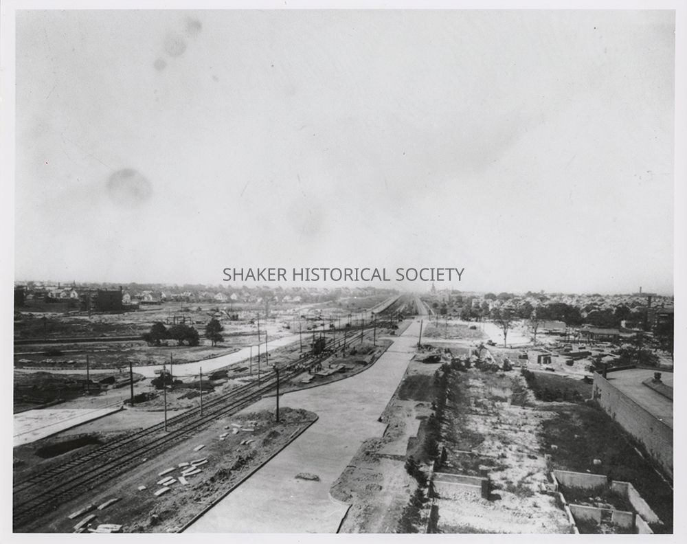 Black-and-white reproduction photograph of early development of Shaker Square in 1920. Original photograph is held by the Western Reserve Historical Society.Photograph Details