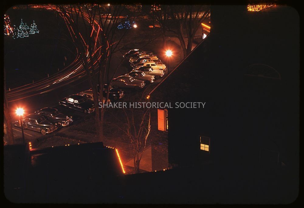 Color slide (Kodachrome) of an elevated view of Shaker Square at night with Christmas lights on the buildings and trees and light trails from moving cars.Photograph Details