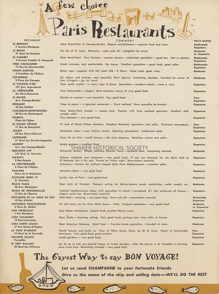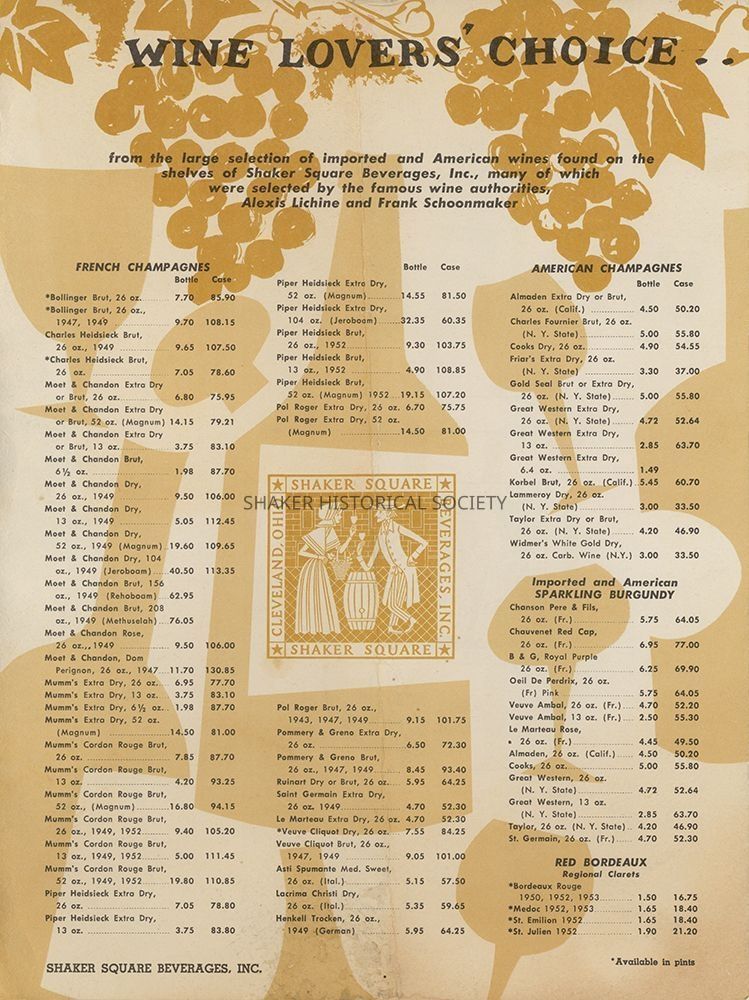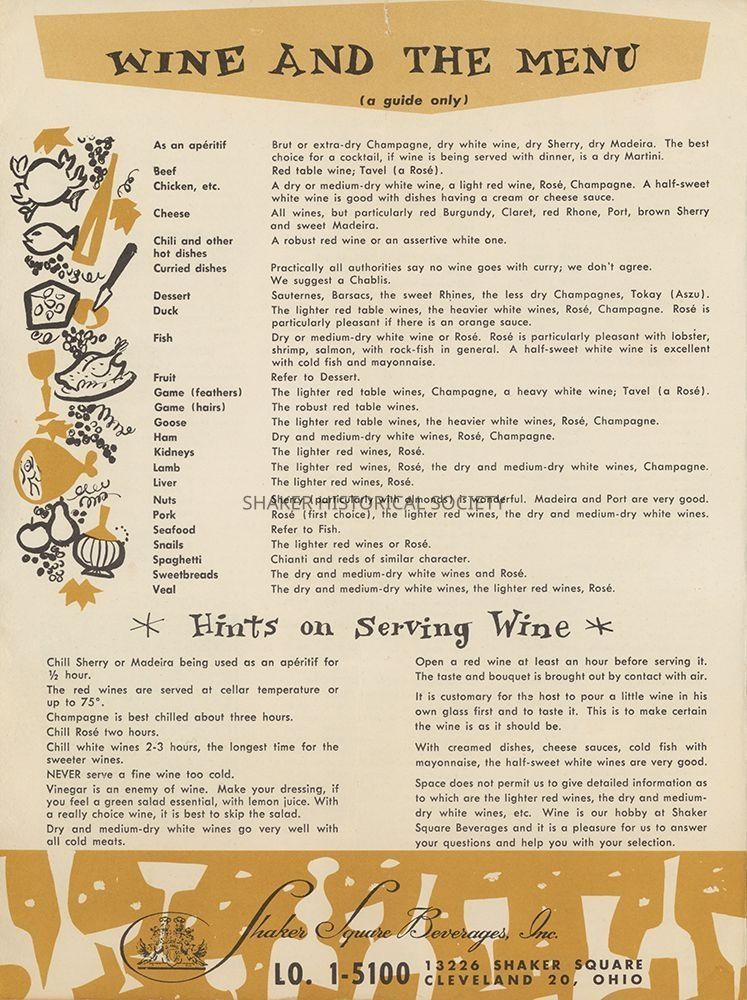 Shaker Square Beverages, Inc. trifold wine list from 1957. Heading along interior pages reads "Wine Lovers' Choice...Fine Wines from Shaker Square Beverages, Inc." Another page features a selection of Paris restaurants, while the back page offers wine and food pairings along with tips on serving wine.Acquisition
