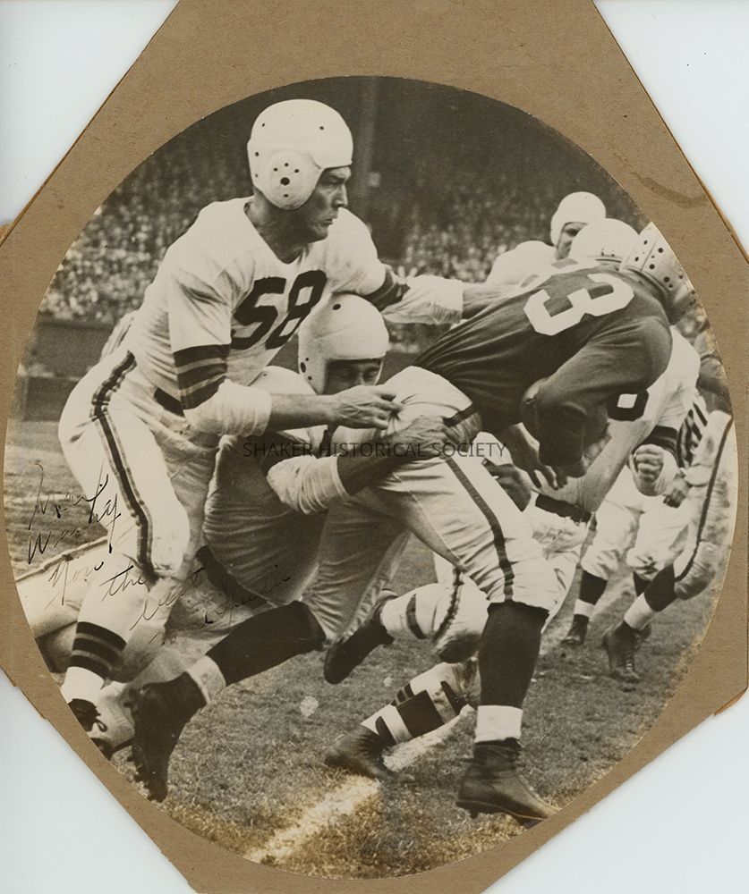 Black-and-white photograph mounted on an octagon-shaped piece of cardboard of Cleveland Browns end Mac Speedie (#58) playing in a football game with an unidentified opposing team. The photograph is signed "Max, wishing you the best -Mac Speedie" in black ink.Photograph Details