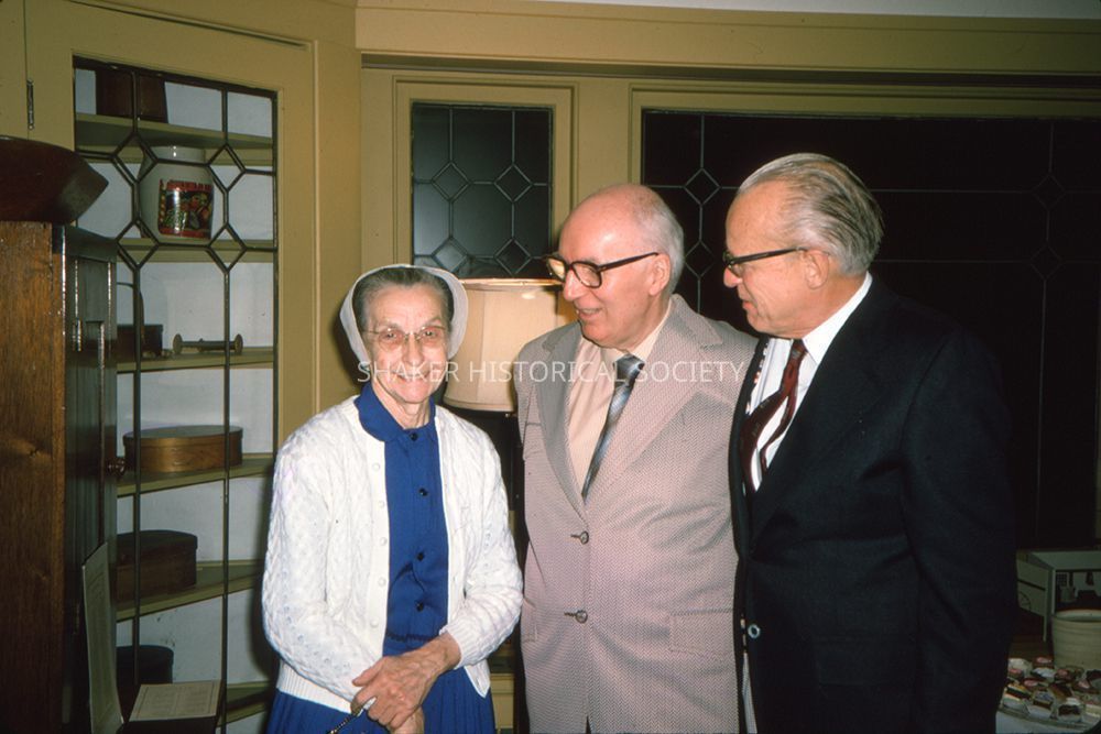 Color slide of Sister Mildred Barker, Frank Myers, and Meredith B. Colket, Jr. at the Shaker Historical Society on November 8, 1974. The museum hosted a dinner for guests from Sabbathday Lake, Maine, including Sister Mildred Barker, Sister Frances Carr, and Brother Theodore Johnson, the curator of the Shaker Museum at Sabbathday Lake. 1974 was the 200th anniversary of the Shaker's arrival in America.Photograph Details
