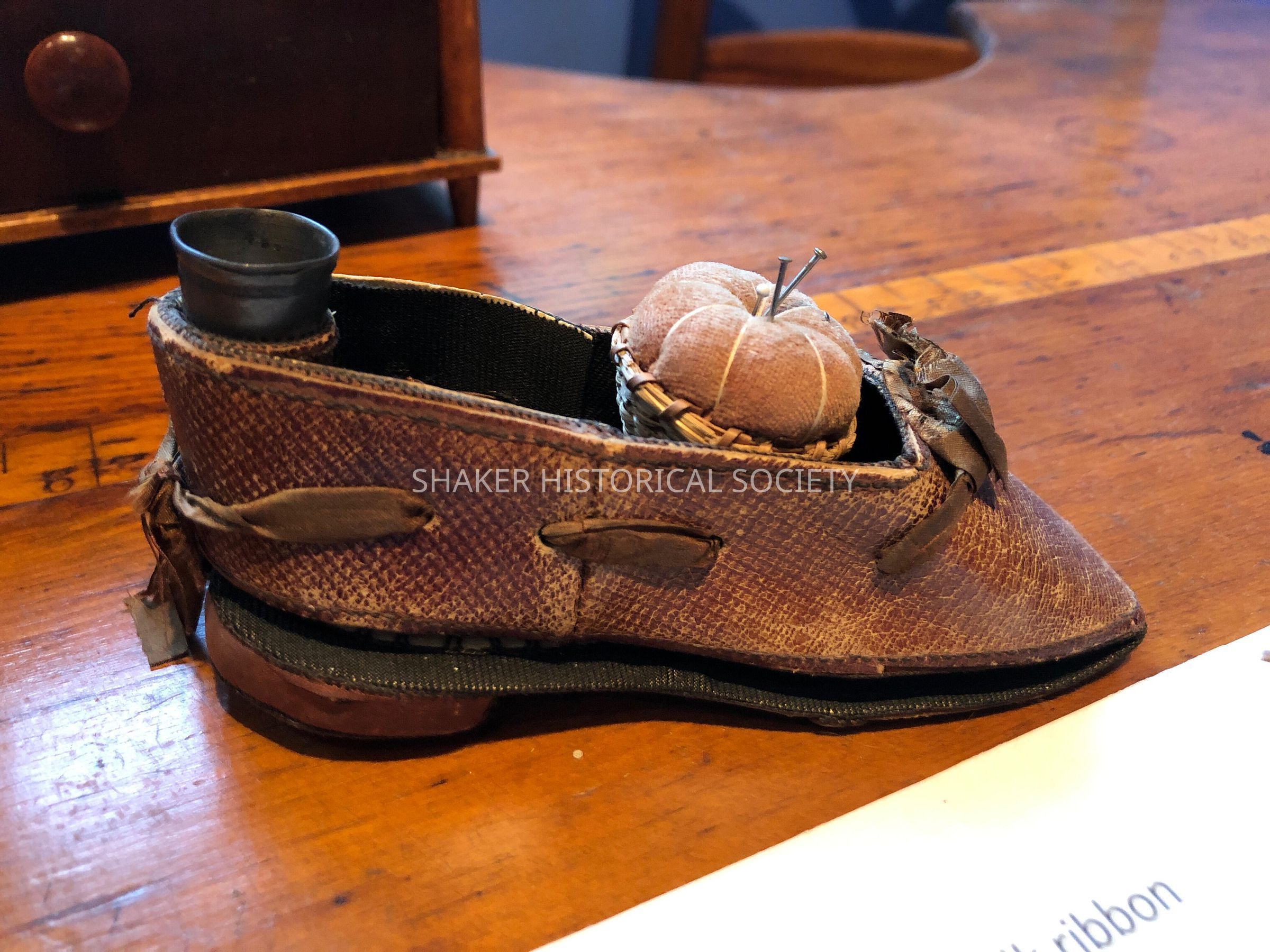 Leather shoe lined with fabric, brown silk ribbon, includes thimble and thimble case, basketry scissors case (scissors missing), red strawberry emery, and miniature basket with velvet tomato pincushion. Canterbury, New Hampshire. The heel lifts up to expose fabric needle holder.Collection