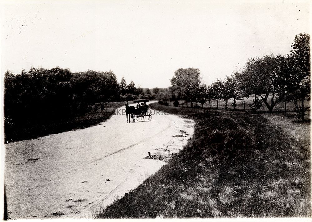 Plate 71 from from Shakers & Kirtland by Louis Baus showing a horse-drawn carriage on South Park Boulevard looking west. Image has a halftone pattern when zoomed in, indicating photo is reproduction of a newspaper image.